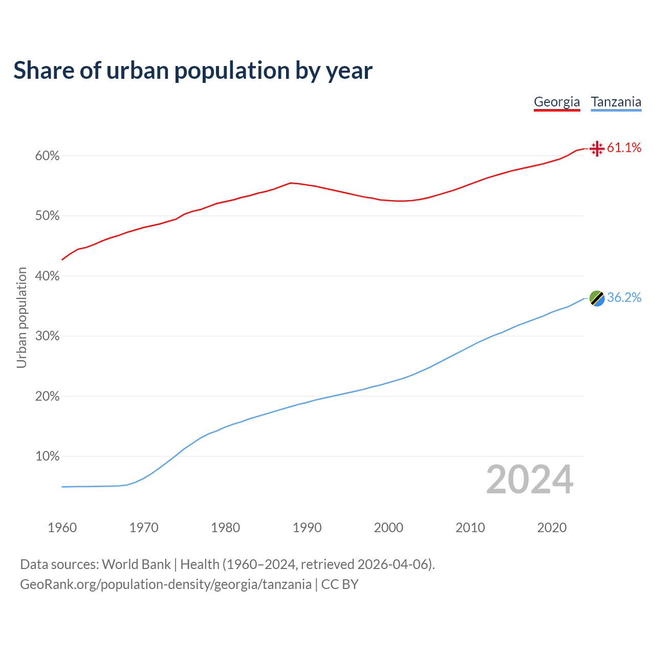 From 2004 to 2024, the share of urban population changed from 52.7% to 61.1% in Georgia and from 24.1% to 36.2% in Tanzania.