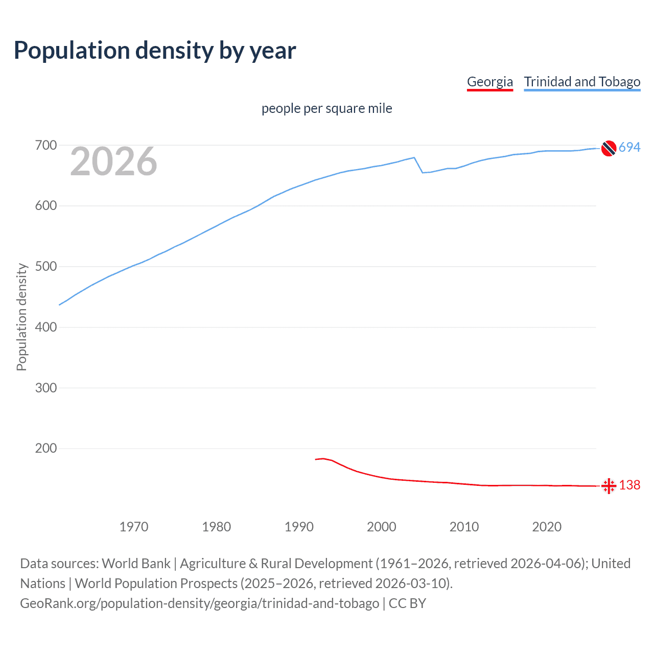 From 2006 to 2026, population density in Georgia decreased by 4.71%, compared to a 5.9% growth in Trinidad and Tobago.