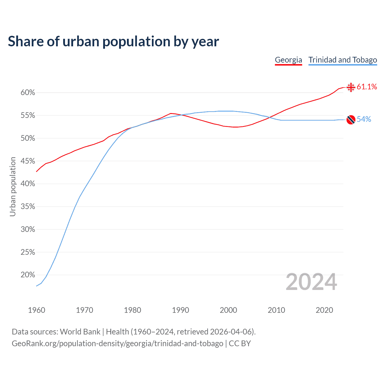 From 2004 to 2024, the share of urban population changed from 52.7% to 61.1% in Georgia and from 55.6% to 54% in Trinidad and Tobago.