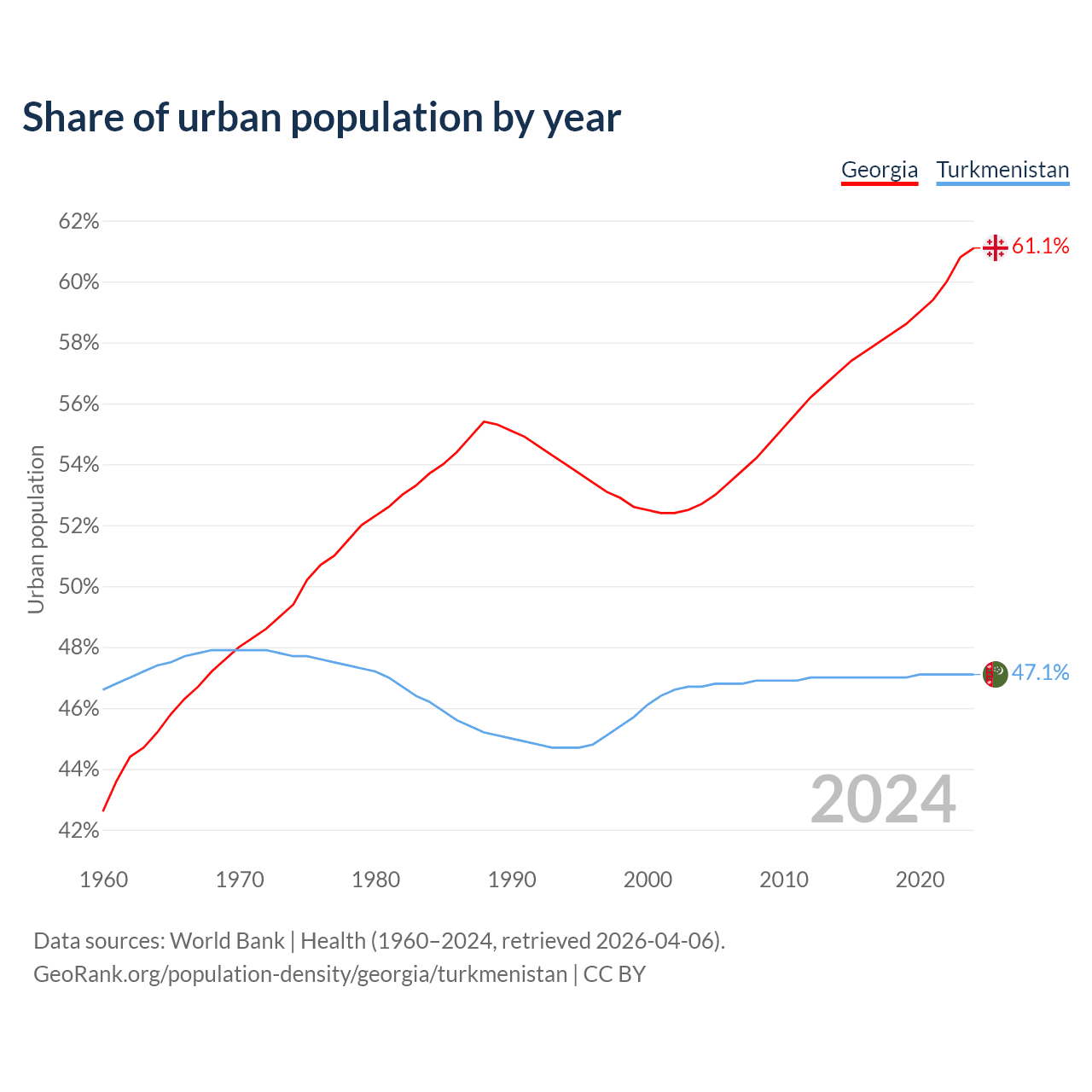 From 2004 to 2024, the share of urban population changed from 52.7% to 61.1% in Georgia and from 46.7% to 47.1% in Turkmenistan.