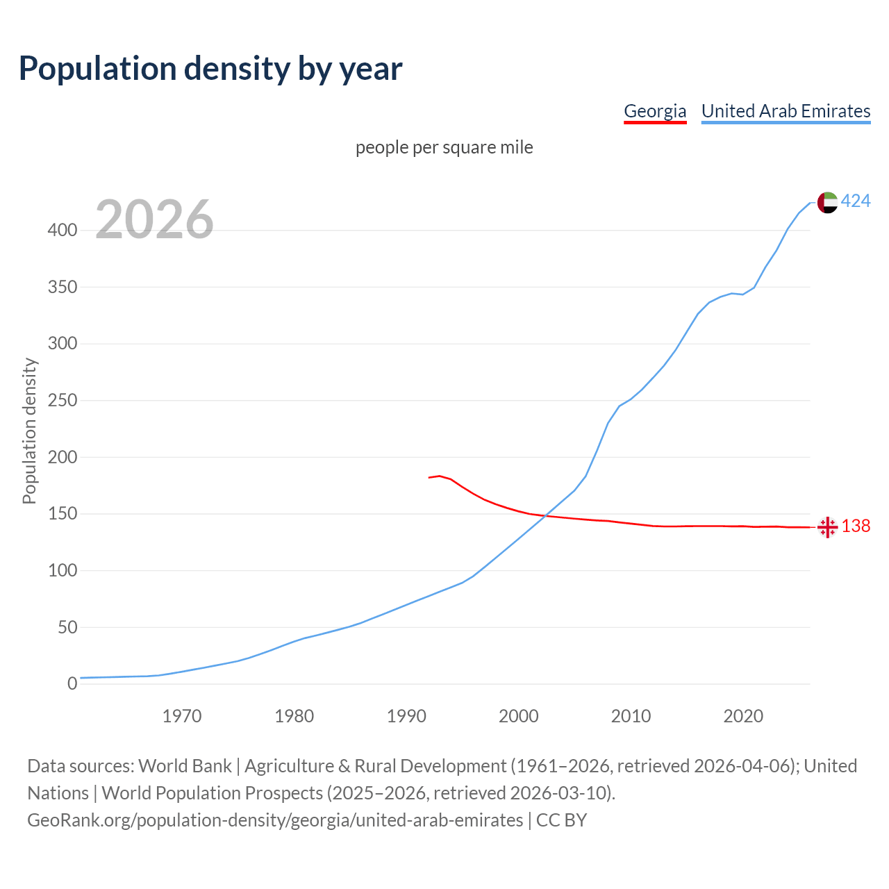From 2006 to 2026, population density in Georgia decreased by 4.71%, compared to a 132.2% growth in the United Arab Emirates.