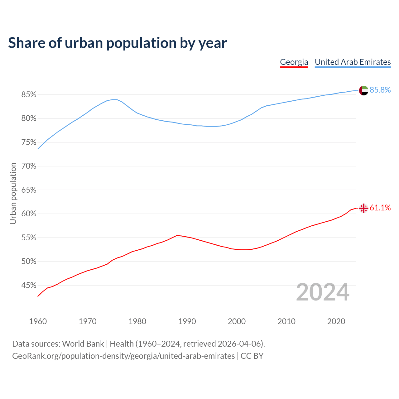 From 2004 to 2024, the share of urban population changed from 52.7% to 61.1% in Georgia and from 81.5% to 85.8% in the United Arab Emirates.