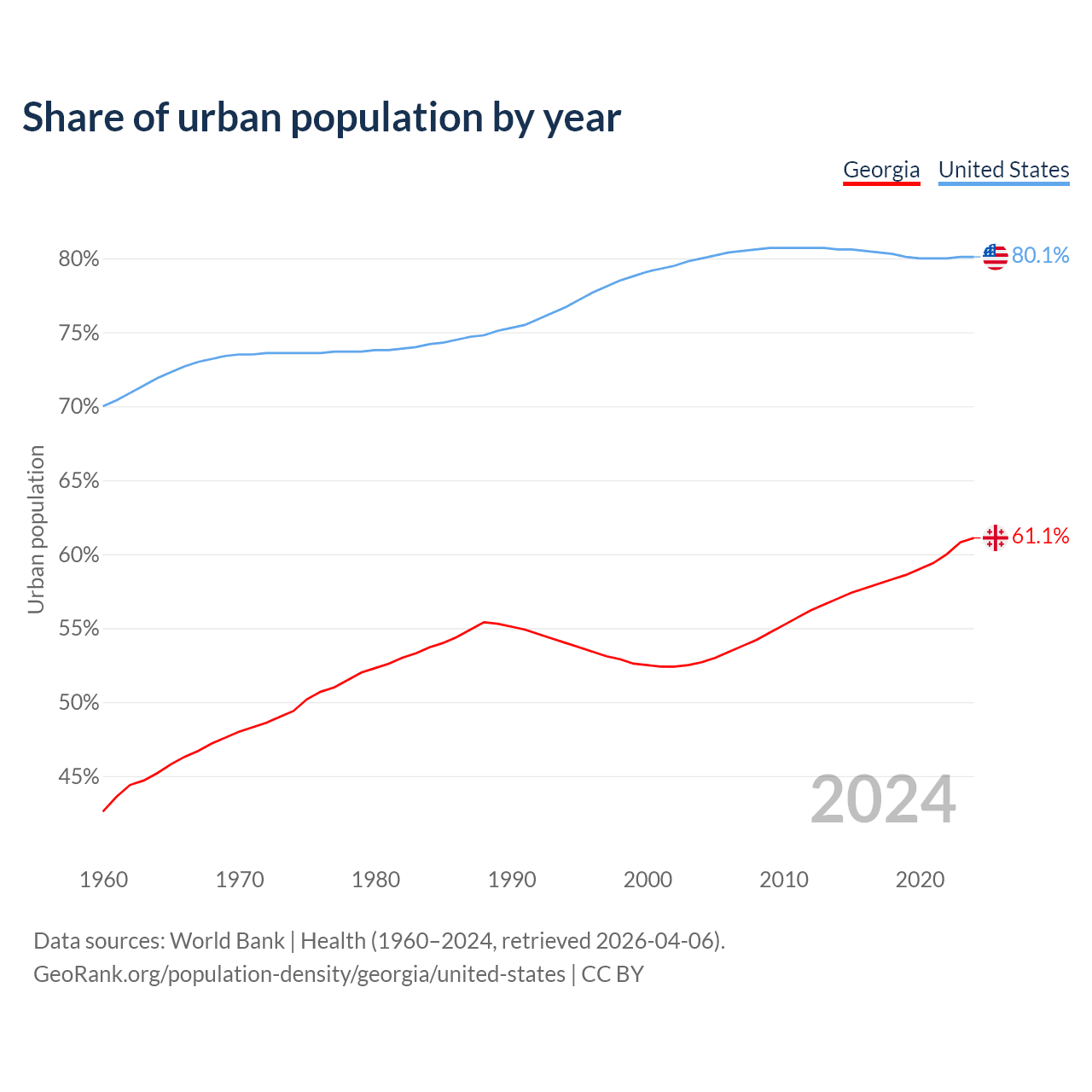 From 2004 to 2024, the share of urban population changed from 52.7% to 61.1% in Georgia and from 80% to 80.1% in the United States.