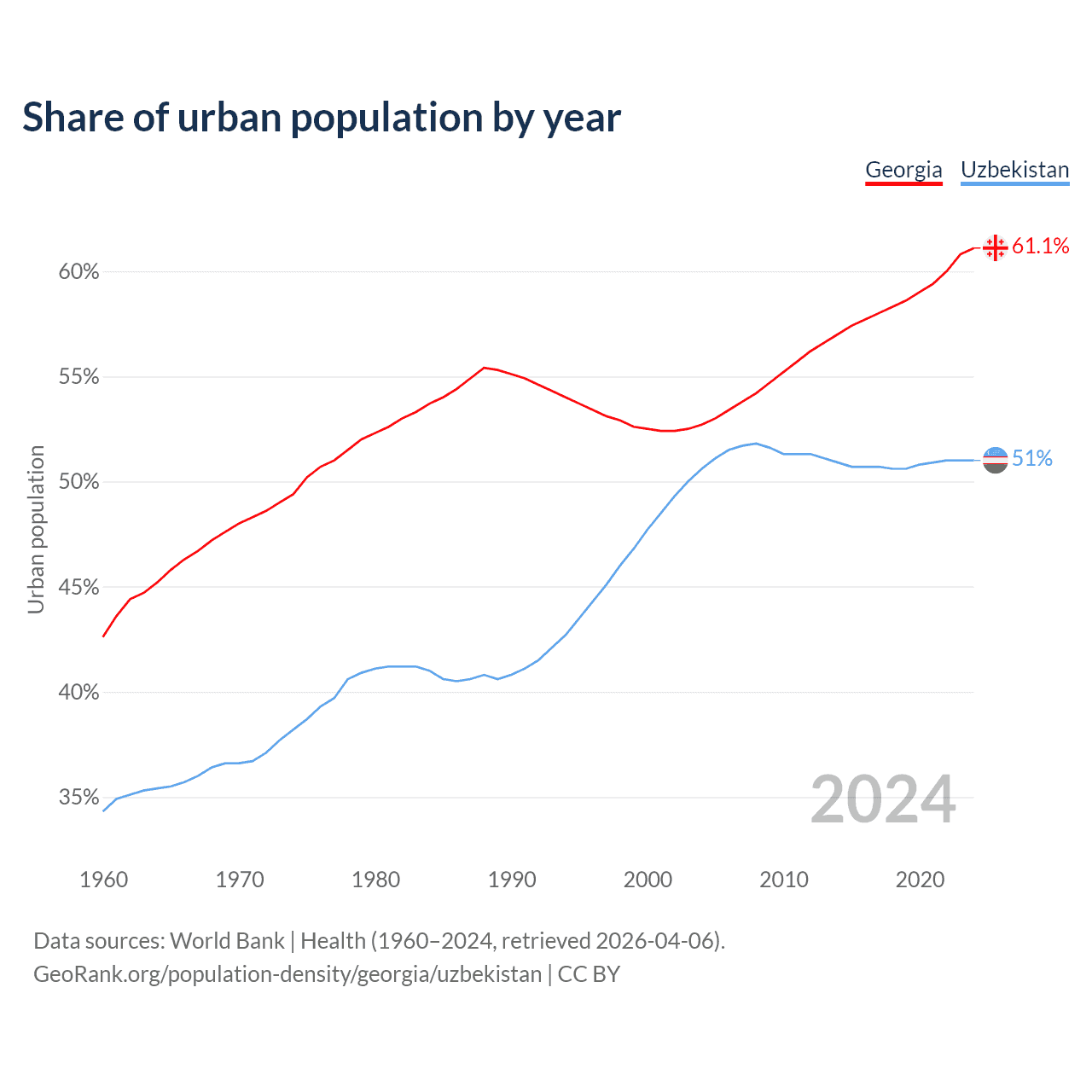 From 2004 to 2024, the share of urban population changed from 52.7% to 61.1% in Georgia and from 50.6% to 51% in Uzbekistan.