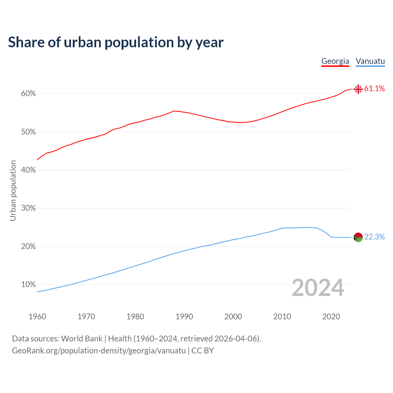 From 2004 to 2024, the share of urban population changed from 52.7% to 61.1% in Georgia and from 22.7% to 22.3% in Vanuatu.