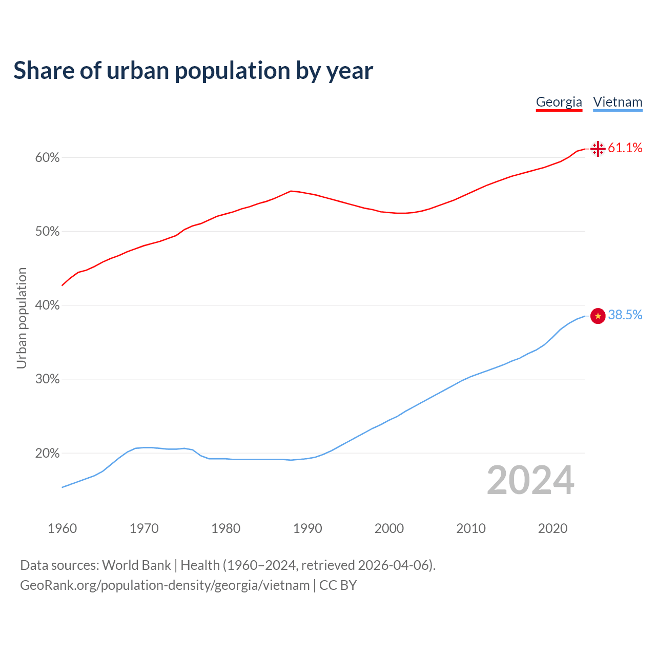 From 2004 to 2024, the share of urban population changed from 52.7% to 61.1% in Georgia and from 26.8% to 38.5% in Vietnam.