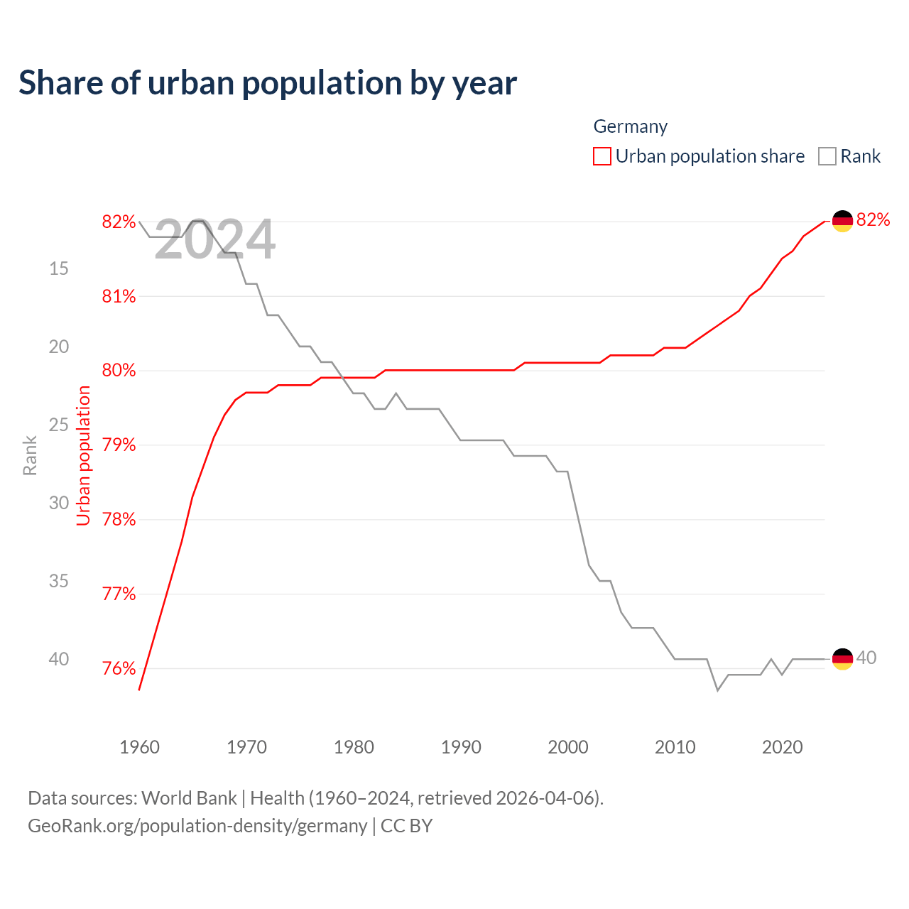 This chart shows the share of urban population in Germany from 1960 to 2024: 75.7% lived in urban areas in 1960, 80.1% in 2000, and 82% in 2024.