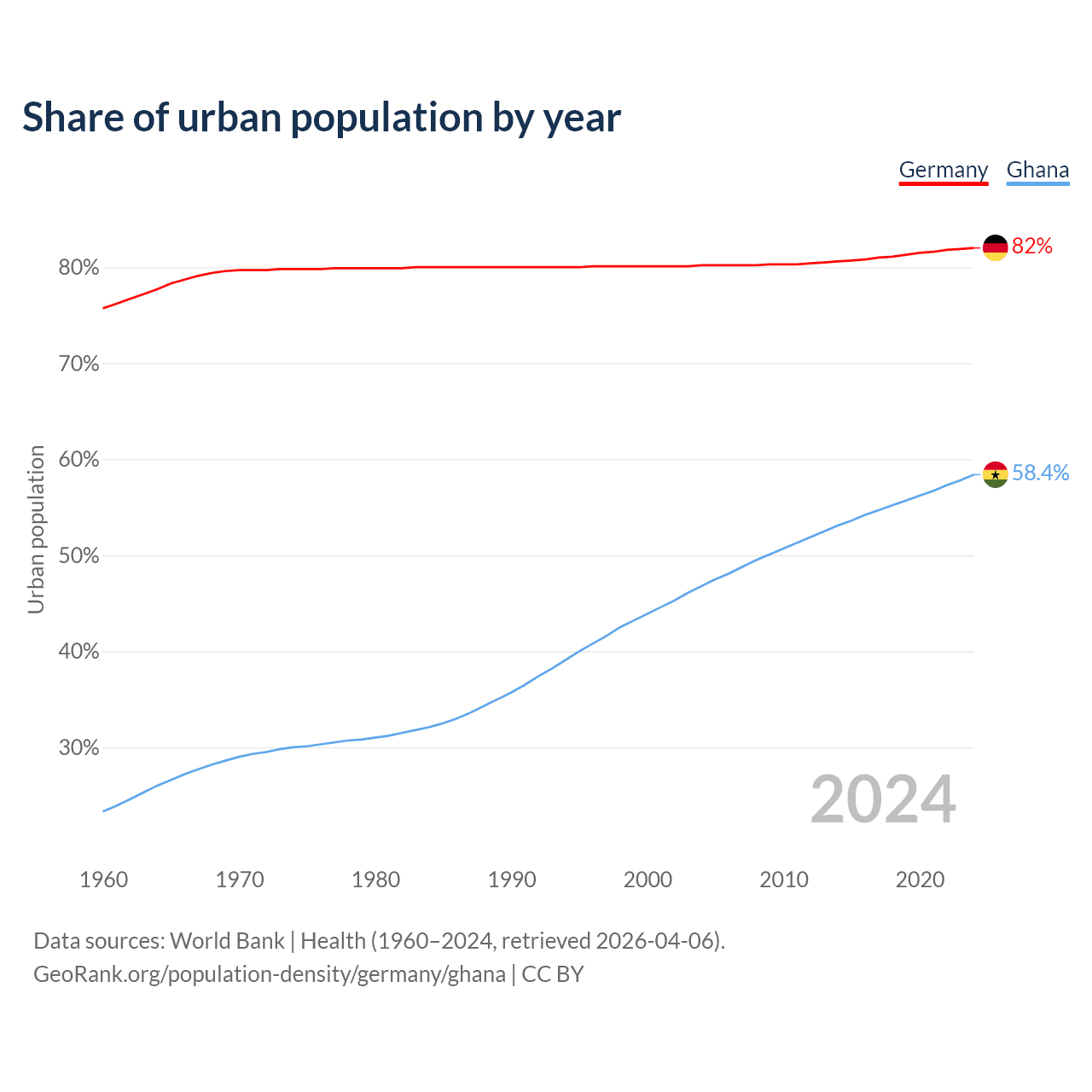From 2004 to 2024, the share of urban population changed from 80.2% to 82% in Germany and from 46.8% to 58.4% in Ghana.
