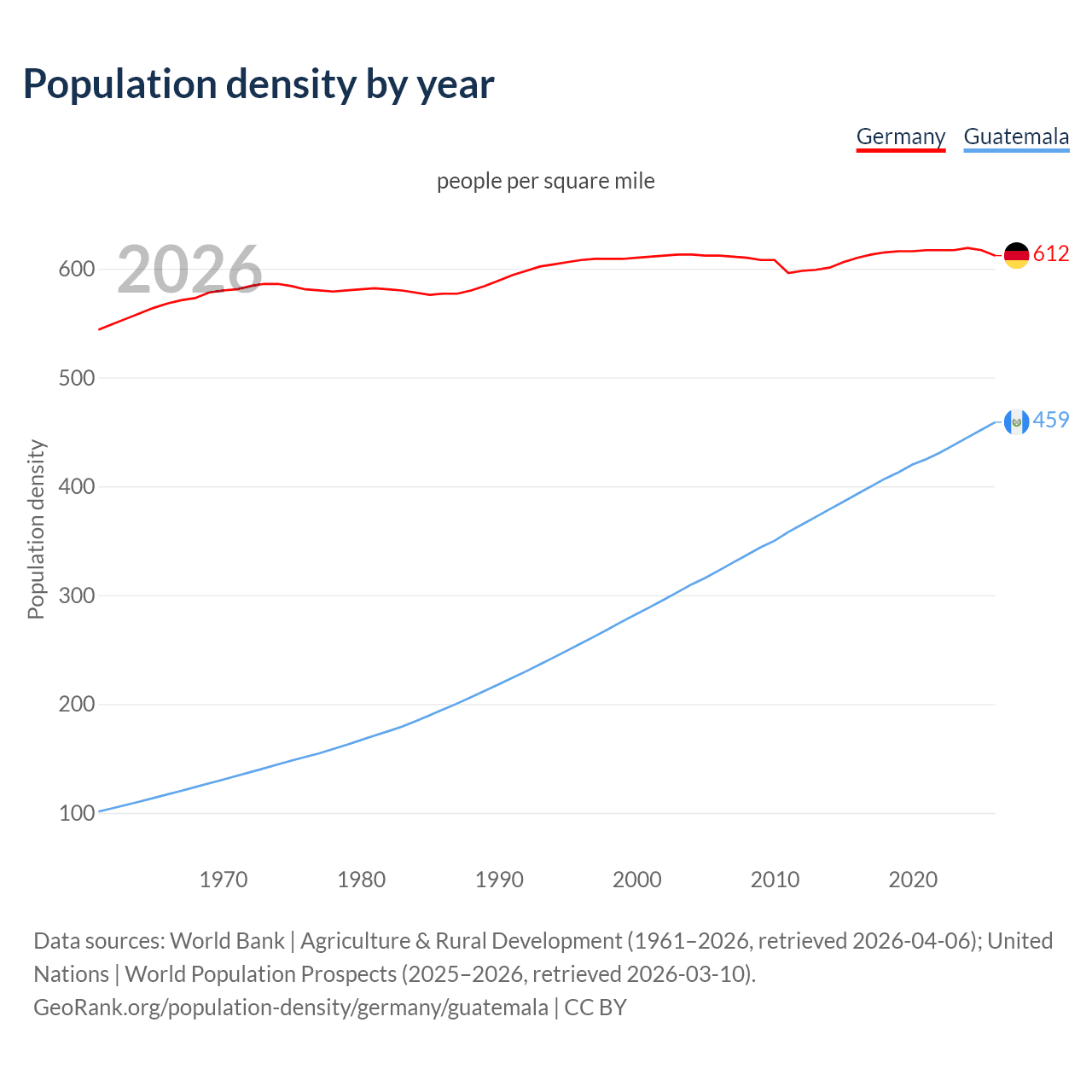 From 2006 to 2026, population density in Germany increased by 0.04%, compared to a 41.9% growth in Guatemala.