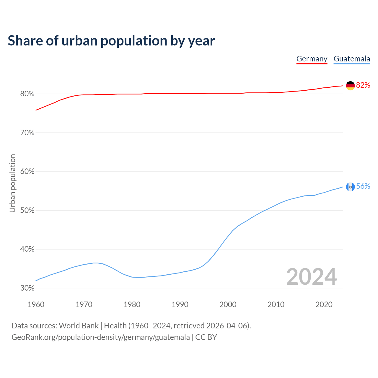 From 2004 to 2024, the share of urban population changed from 80.2% to 82% in Germany and from 47.3% to 56% in Guatemala.