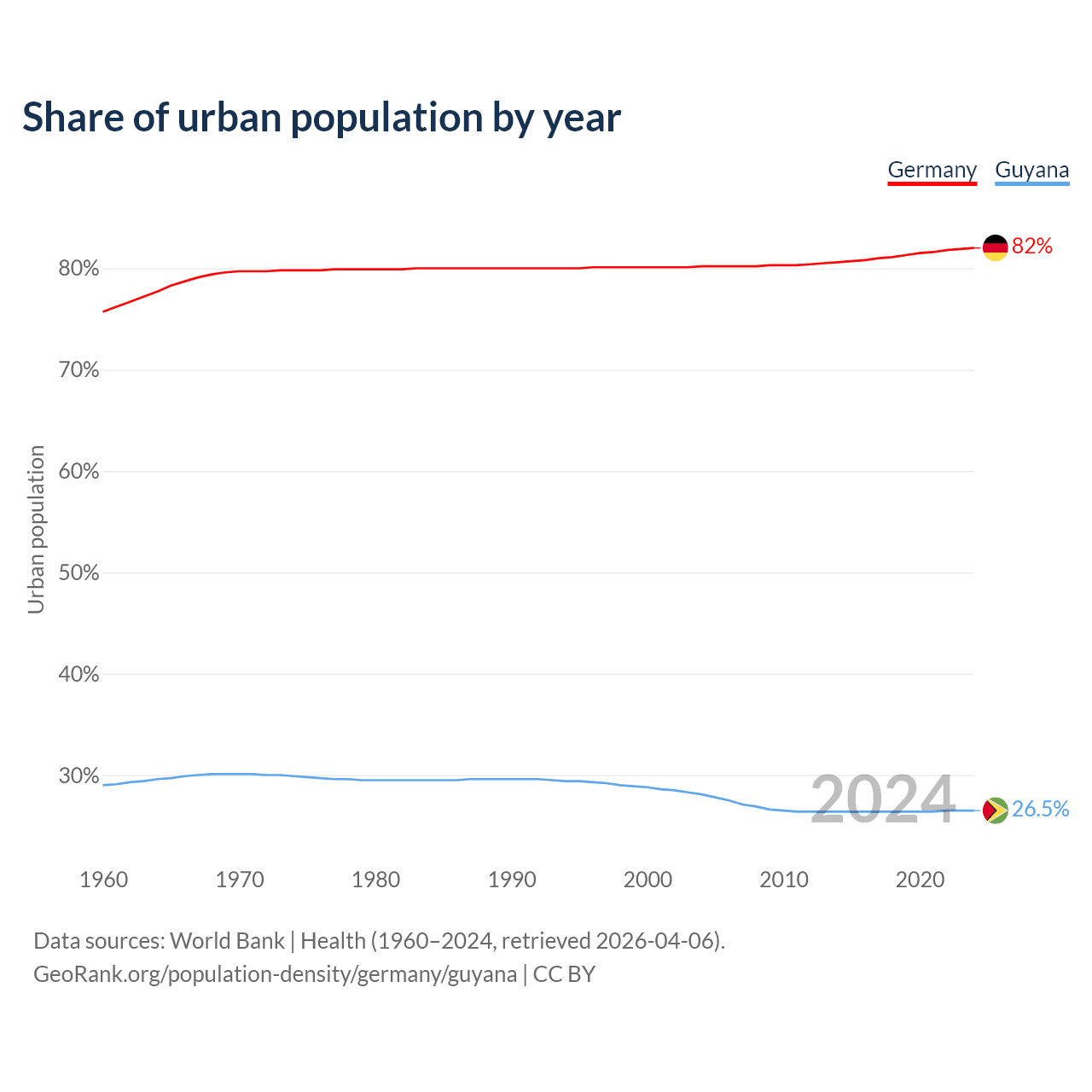 From 2004 to 2024, the share of urban population changed from 80.2% to 82% in Germany and from 28.1% to 26.5% in Guyana.