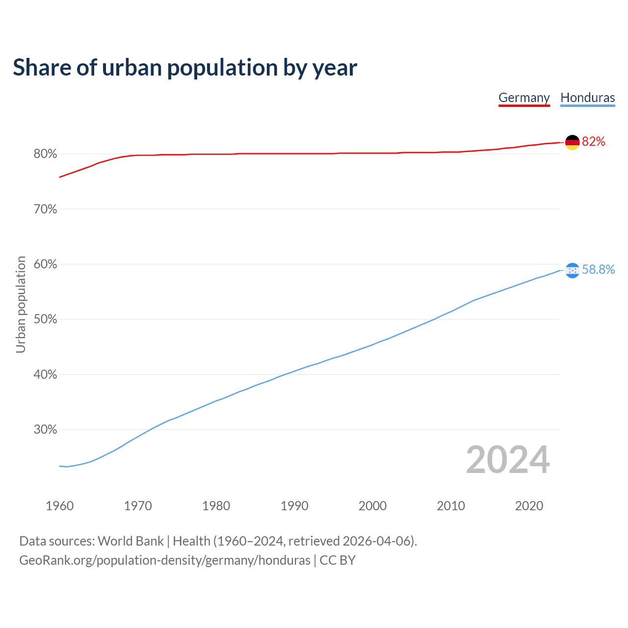 From 2004 to 2024, the share of urban population changed from 80.2% to 82% in Germany and from 47.6% to 58.8% in Honduras.