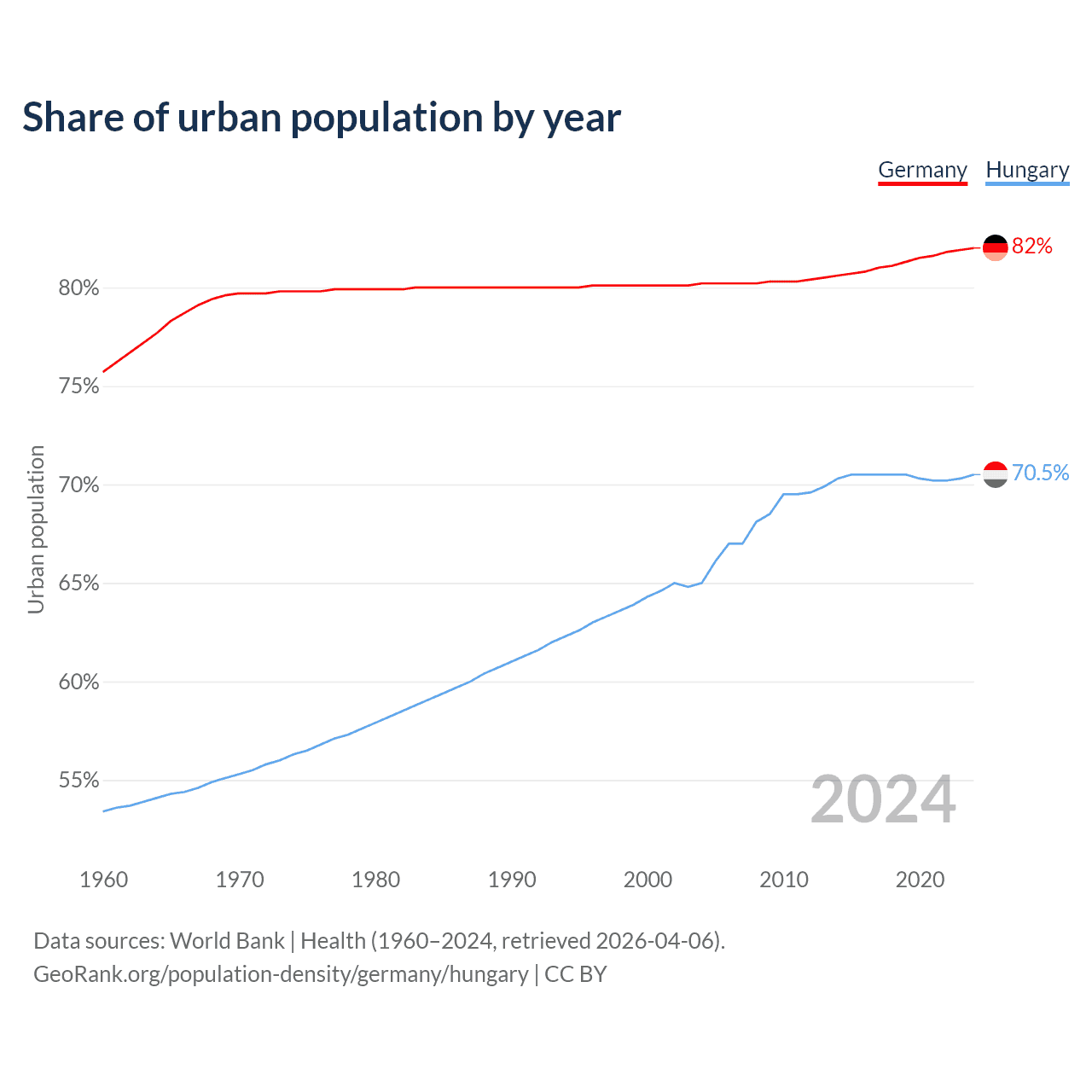 From 2004 to 2024, the share of urban population changed from 80.2% to 82% in Germany and from 65% to 70.5% in Hungary.