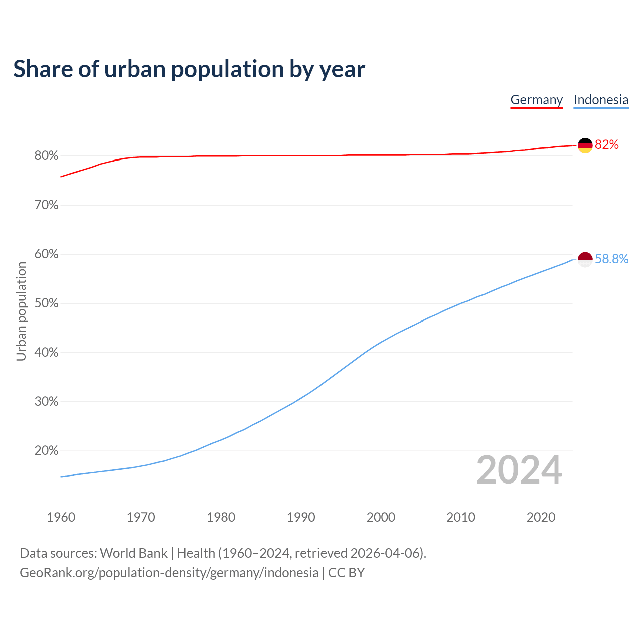 From 2004 to 2024, the share of urban population changed from 80.2% to 82% in Germany and from 45.4% to 58.8% in Indonesia.