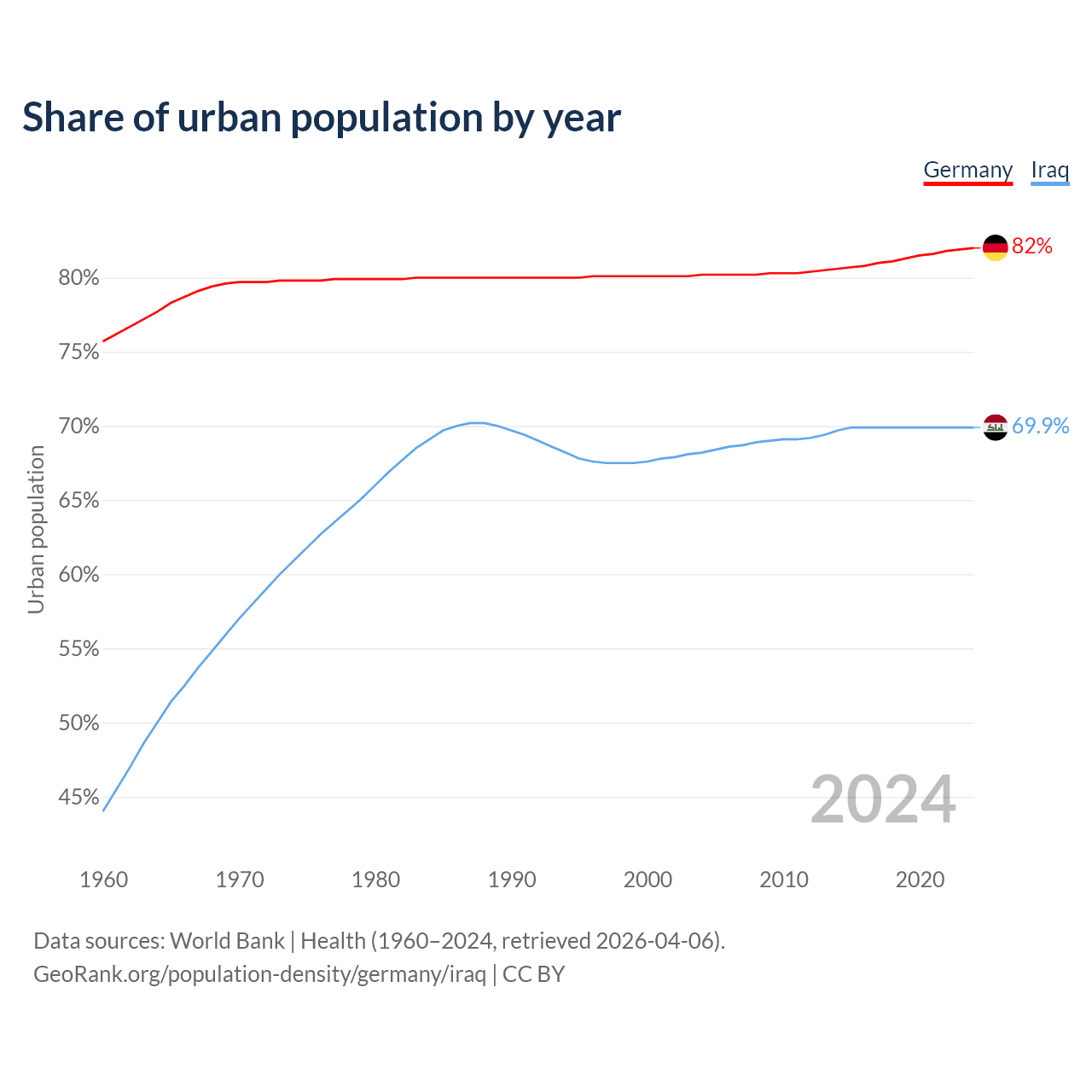 From 2004 to 2024, the share of urban population changed from 80.2% to 82% in Germany and from 68.2% to 69.9% in Iraq.