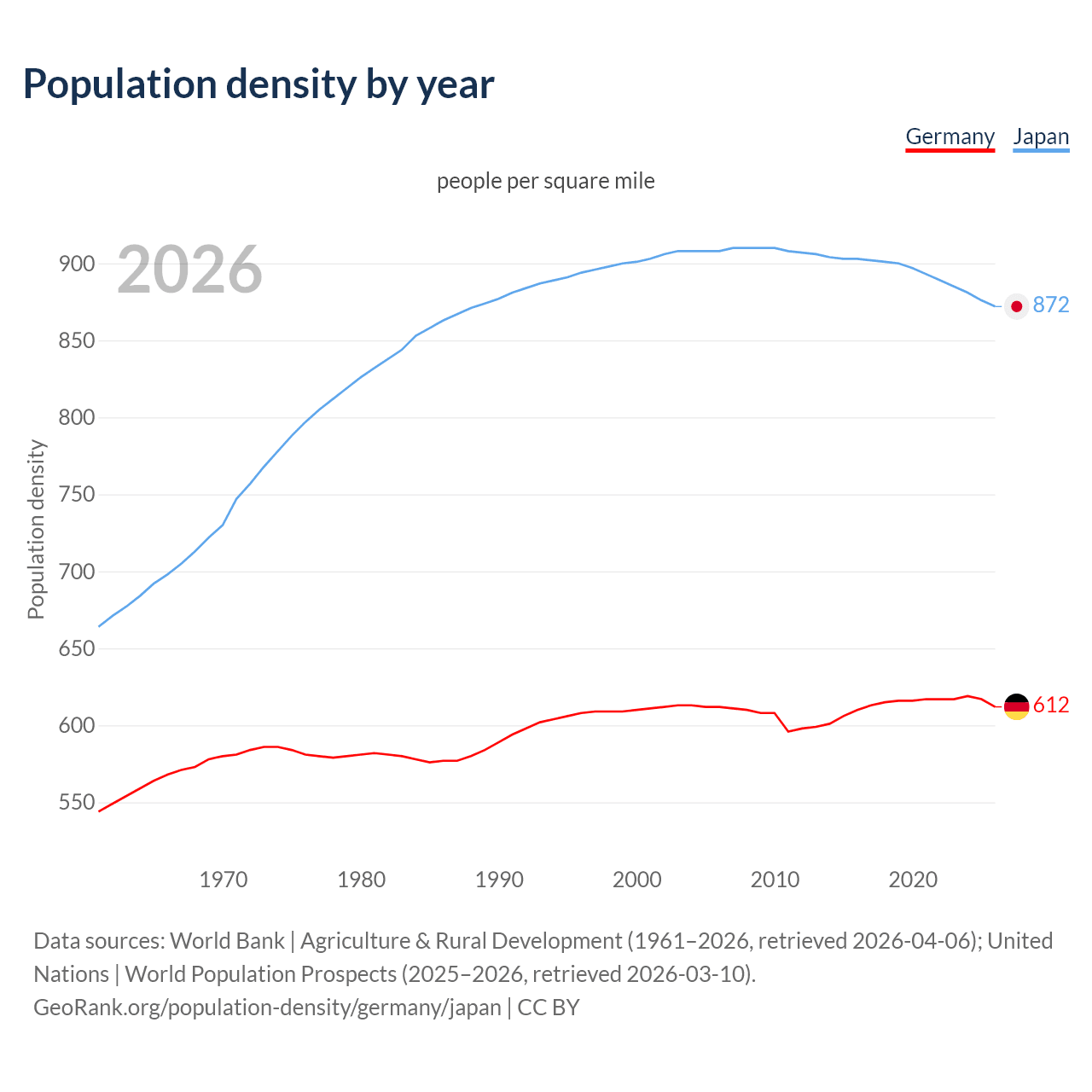 From 2006 to 2026, population density in Germany increased by 0.04%, compared to a 4.07% decline in Japan.