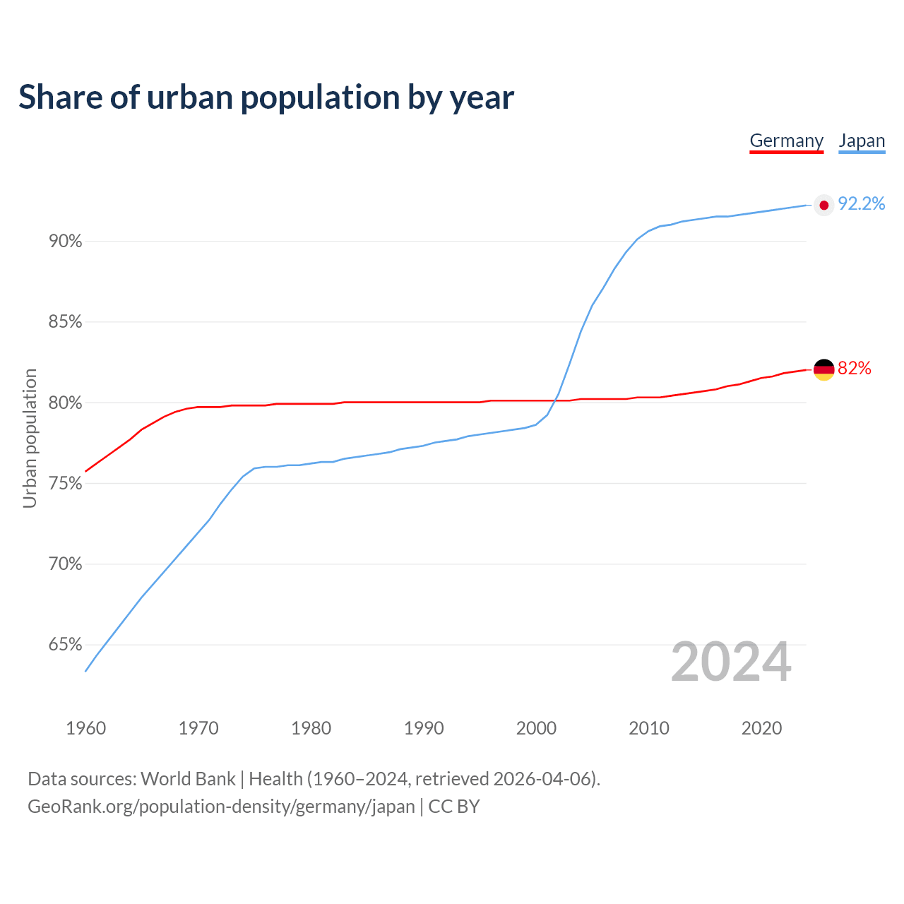 From 2004 to 2024, the share of urban population changed from 80.2% to 82% in Germany and from 84.4% to 92.2% in Japan.