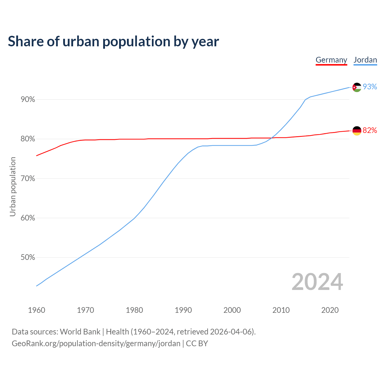 From 2004 to 2024, the share of urban population changed from 80.2% to 82% in Germany and from 78.3% to 93% in Jordan.