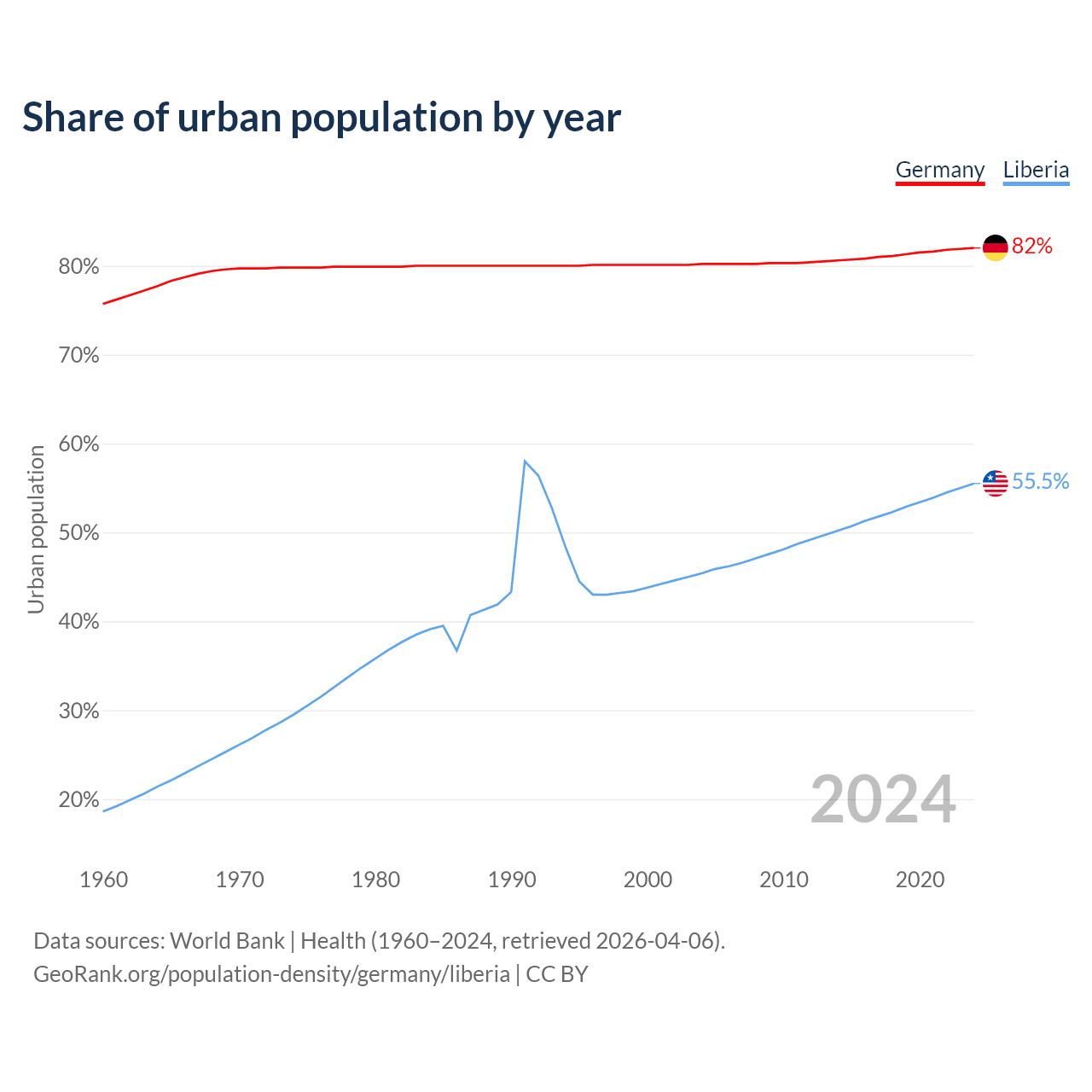 From 2004 to 2024, the share of urban population changed from 80.2% to 82% in Germany and from 45.4% to 55.5% in Liberia.