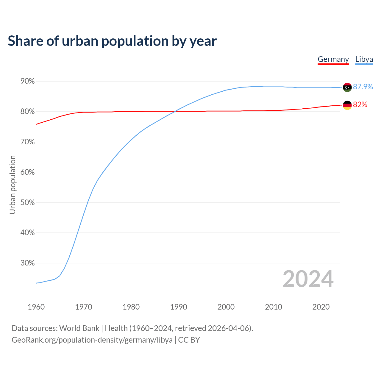 From 2004 to 2024, the share of urban population changed from 80.2% to 82% in Germany and from 88% to 87.9% in Libya.