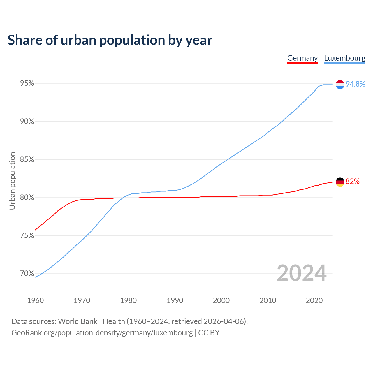 From 2004 to 2024, the share of urban population changed from 80.2% to 82% in Germany and from 86% to 94.8% in Luxembourg.