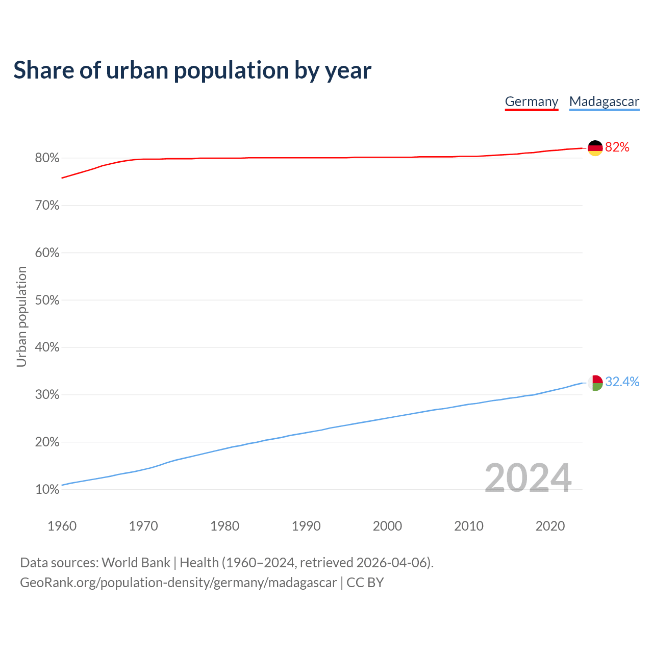 From 2004 to 2024, the share of urban population changed from 80.2% to 82% in Germany and from 26.2% to 32.4% in Madagascar.