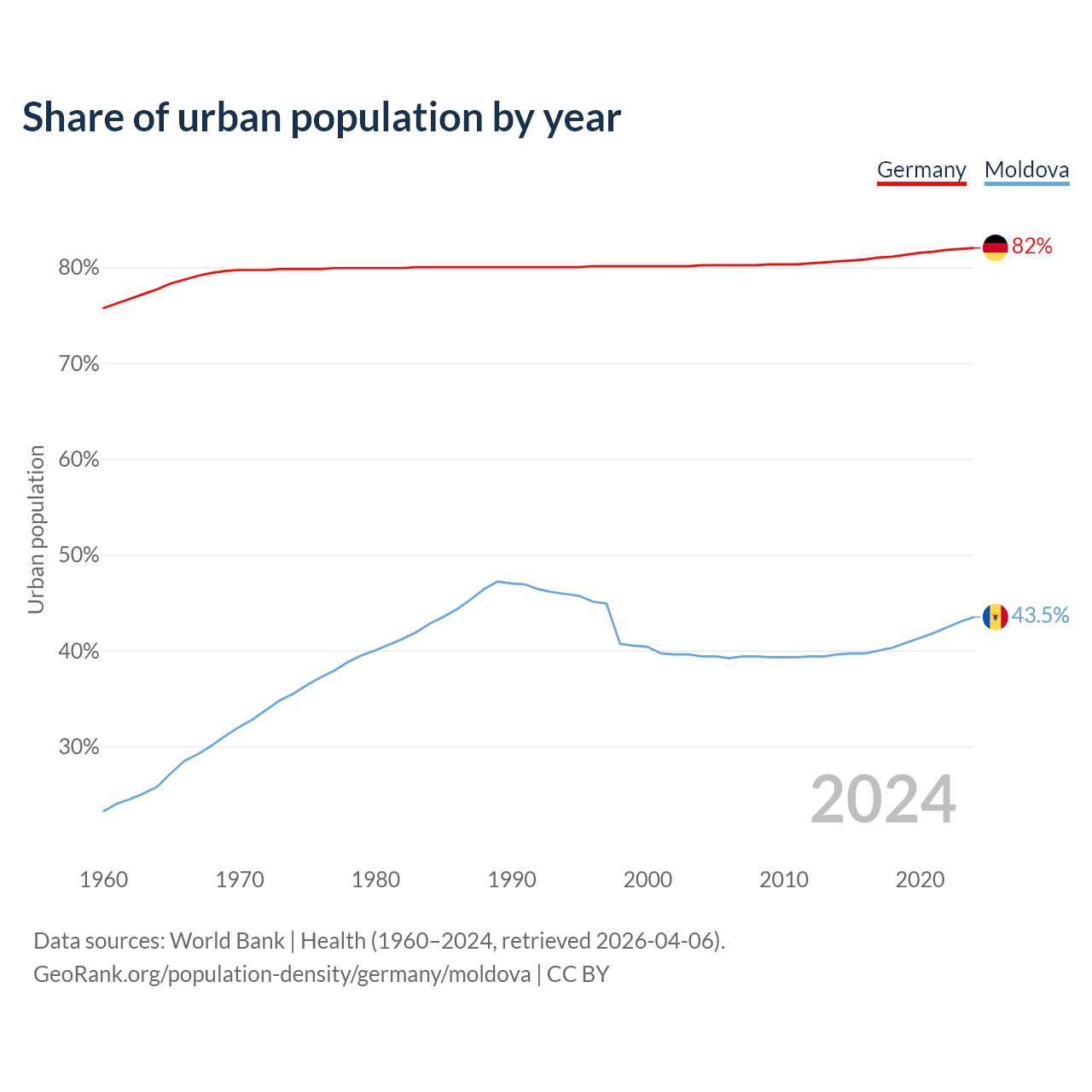 From 2004 to 2024, the share of urban population changed from 80.2% to 82% in Germany and from 39.4% to 43.5% in Moldova.