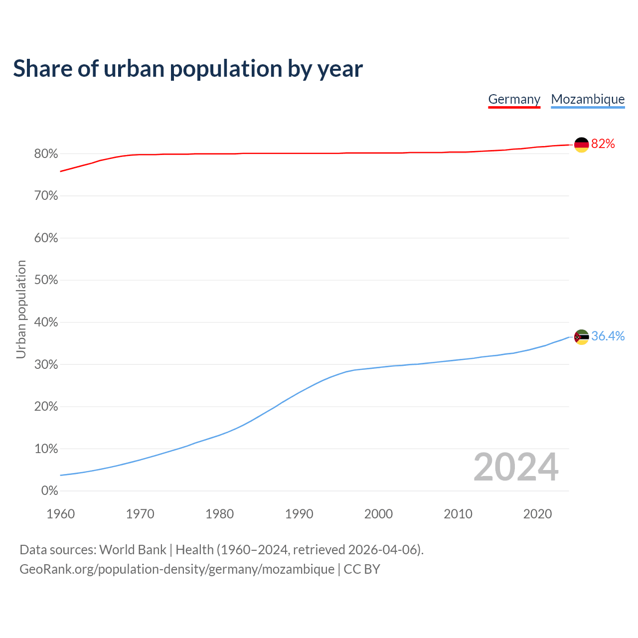 From 2004 to 2024, the share of urban population changed from 80.2% to 82% in Germany and from 29.9% to 36.4% in Mozambique.