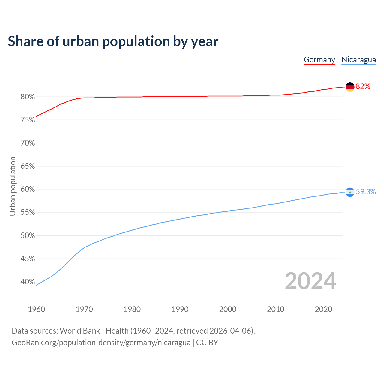 From 2004 to 2024, the share of urban population changed from 80.2% to 82% in Germany and from 55.8% to 59.3% in Nicaragua.