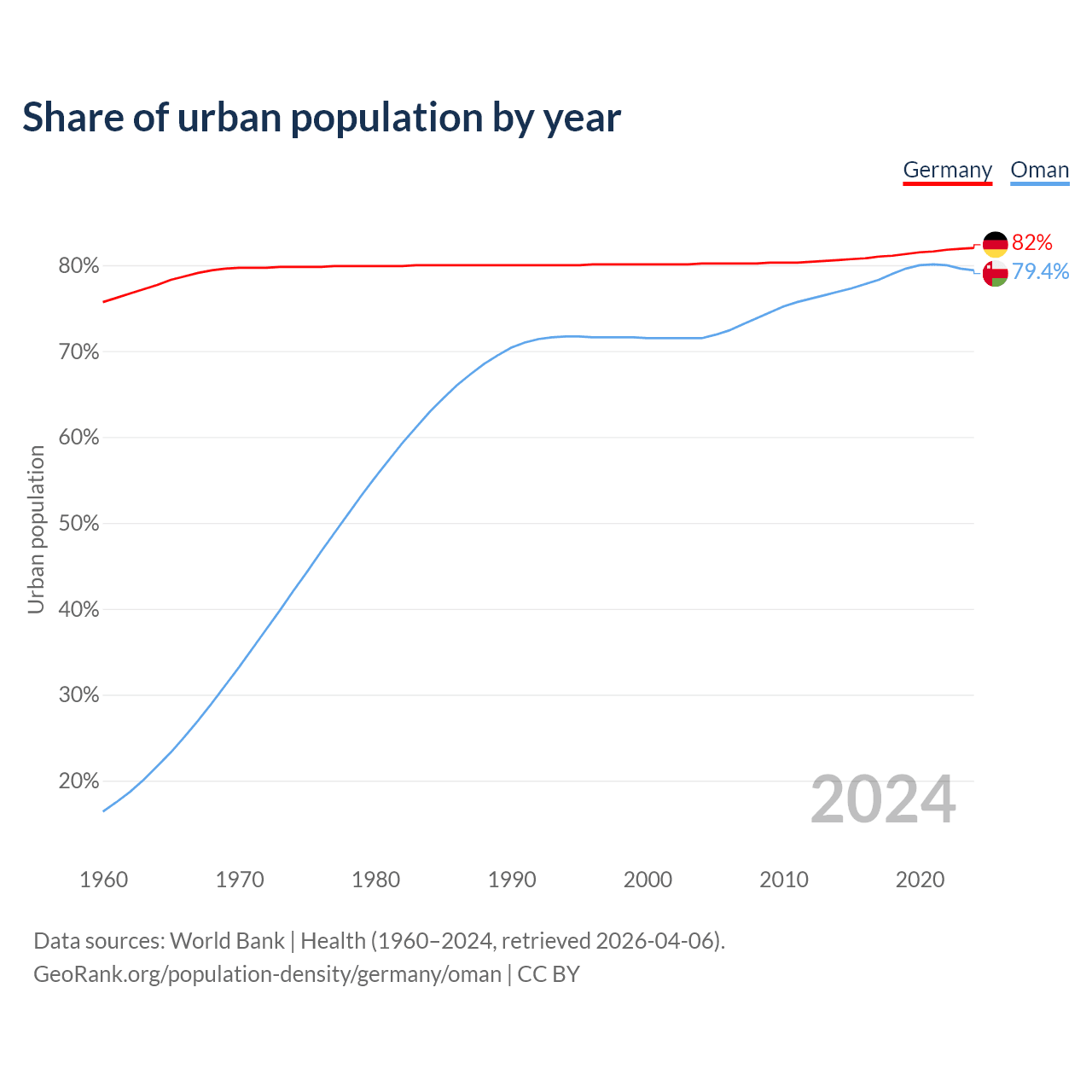 From 2004 to 2024, the share of urban population changed from 80.2% to 82% in Germany and from 71.5% to 79.4% in Oman.