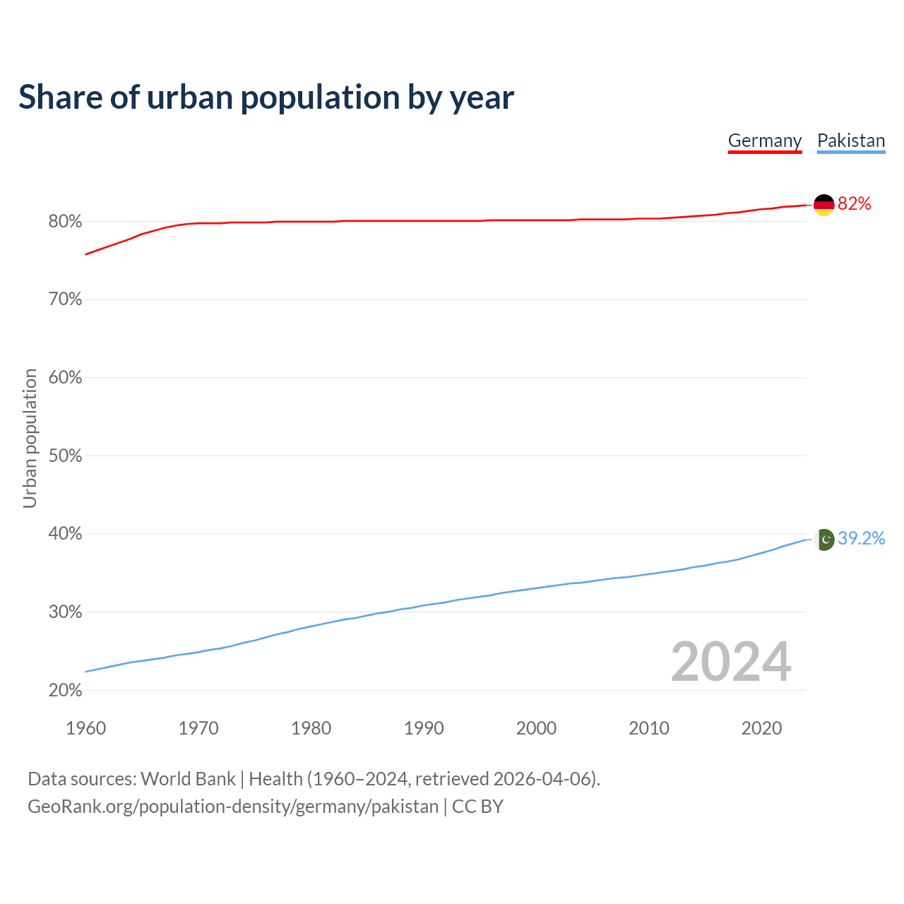 From 2004 to 2024, the share of urban population changed from 80.2% to 82% in Germany and from 33.7% to 39.2% in Pakistan.