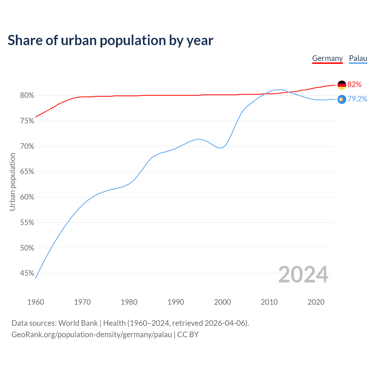 From 2004 to 2024, the share of urban population changed from 80.2% to 82% in Germany and from 76.4% to 79.2% in Palau.