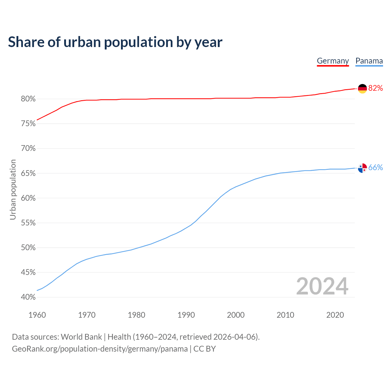 From 2004 to 2024, the share of urban population changed from 80.2% to 82% in Germany and from 63.8% to 66% in Panama.