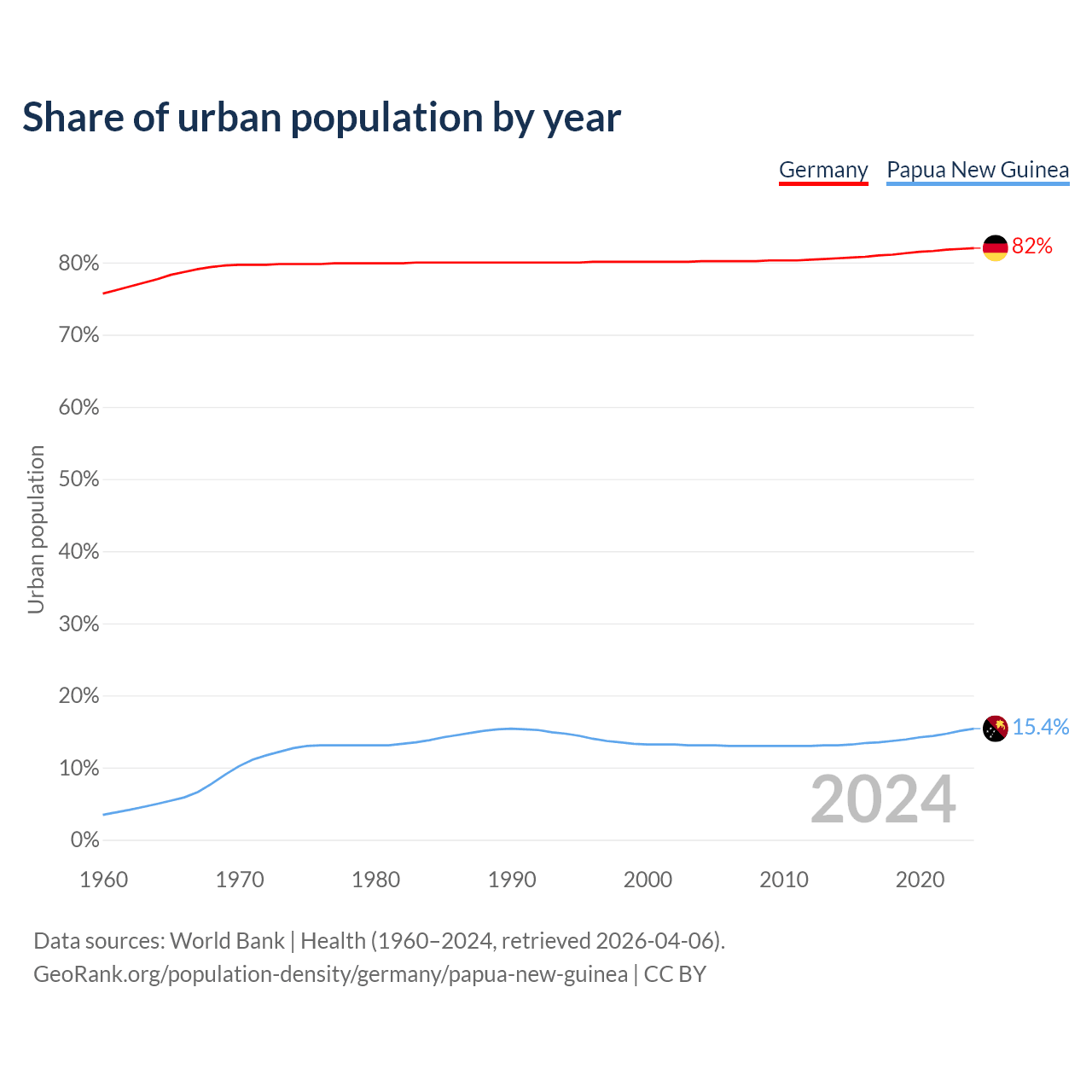 From 2004 to 2024, the share of urban population changed from 80.2% to 82% in Germany and from 13.1% to 15.4% in Papua New Guinea.