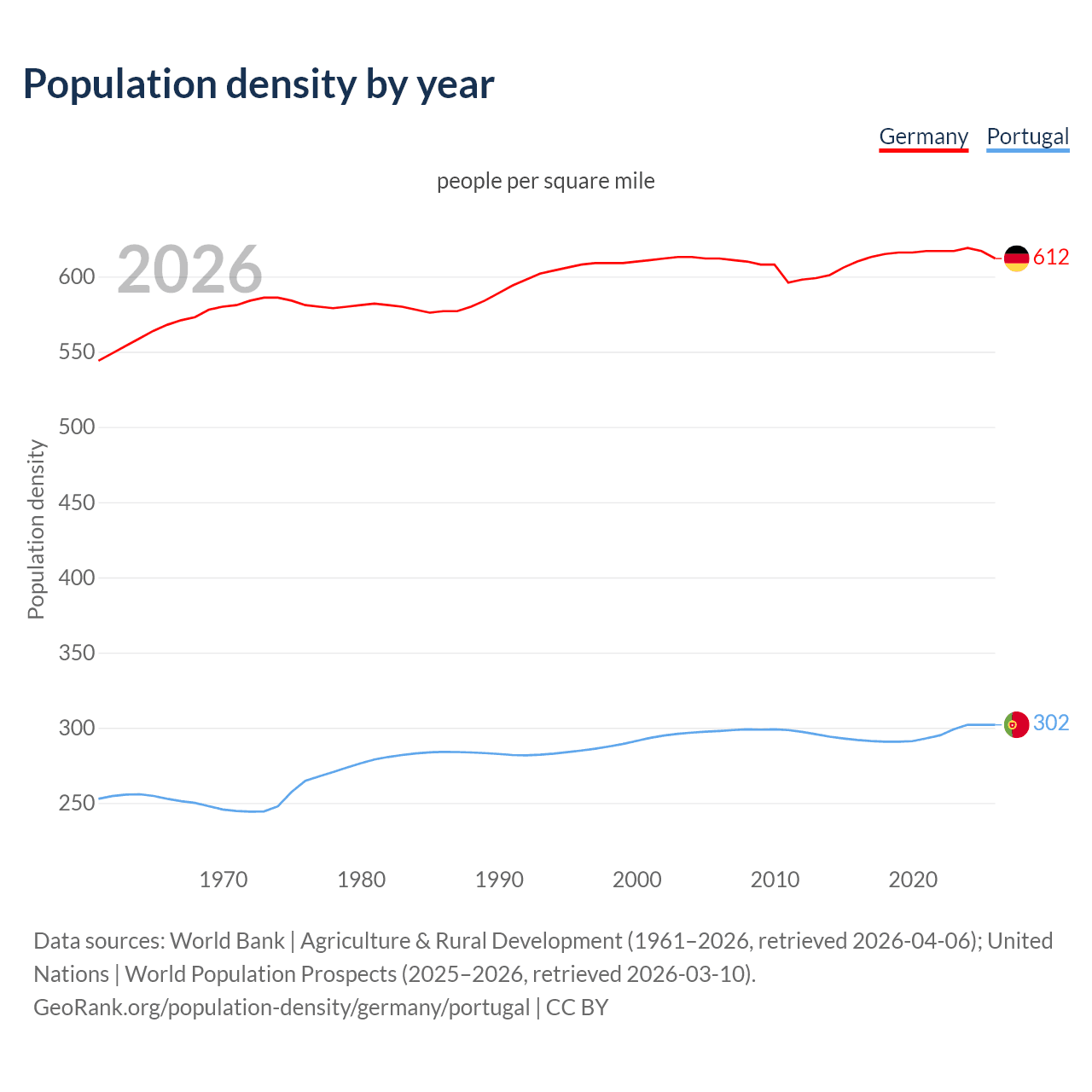 From 2006 to 2026, population density in Germany increased by 0.04%, compared to a 1.23% growth in Portugal.