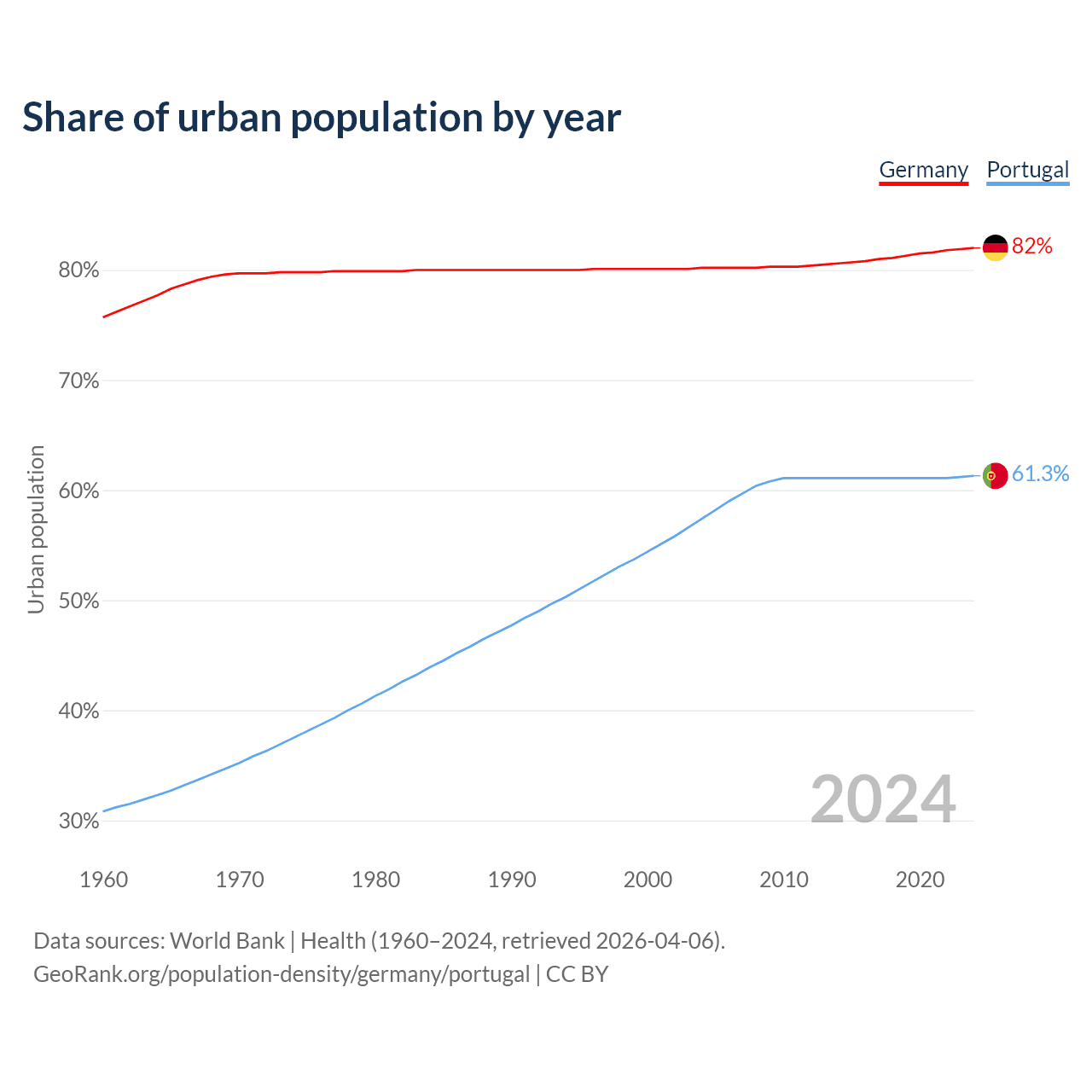 From 2004 to 2024, the share of urban population changed from 80.2% to 82% in Germany and from 57.4% to 61.3% in Portugal.