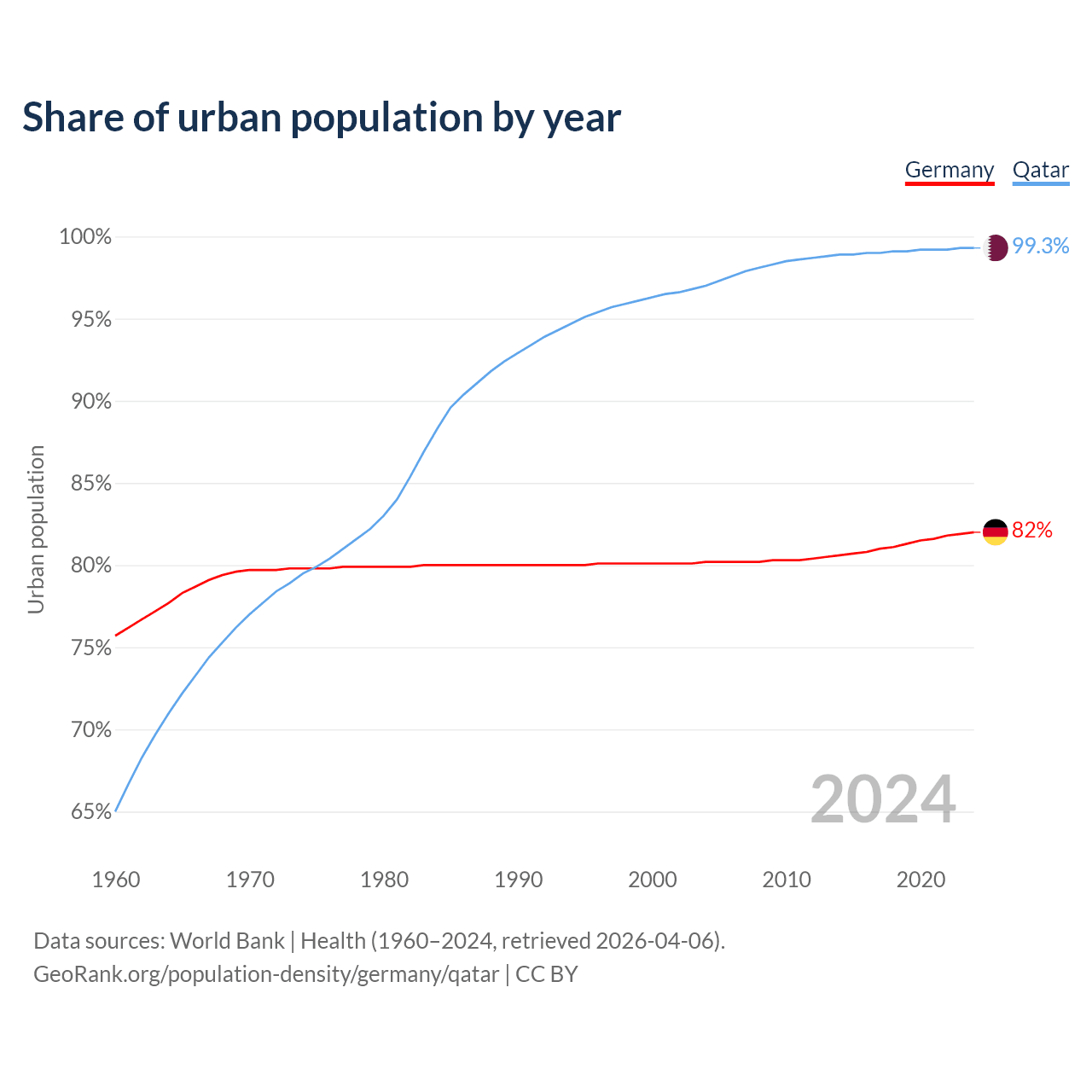 From 2004 to 2024, the share of urban population changed from 80.2% to 82% in Germany and from 97% to 99.3% in Qatar.