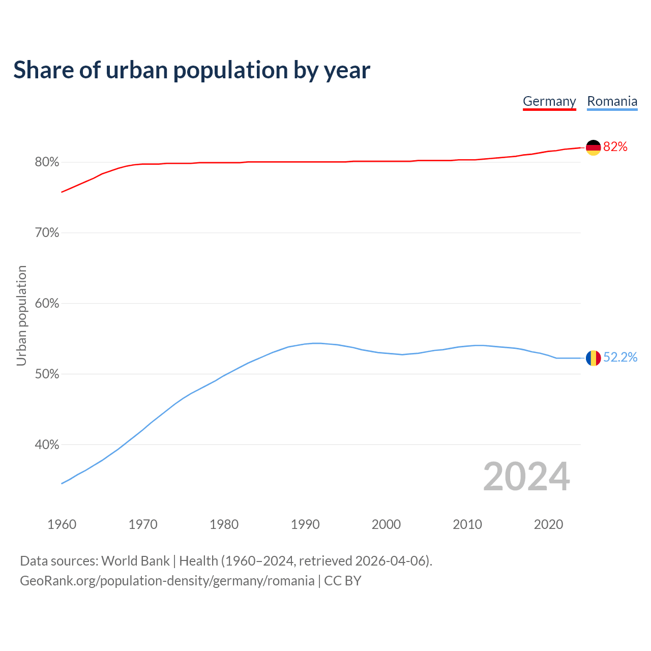 From 2004 to 2024, the share of urban population changed from 80.2% to 82% in Germany and from 52.9% to 52.2% in Romania.