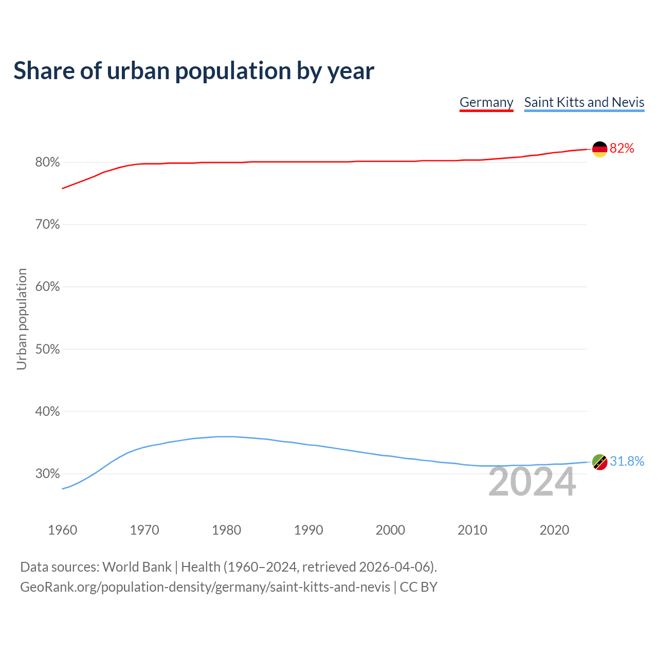 From 2004 to 2024, the share of urban population changed from 80.2% to 82% in Germany and from 32.1% to 31.8% in Saint Kitts and Nevis.