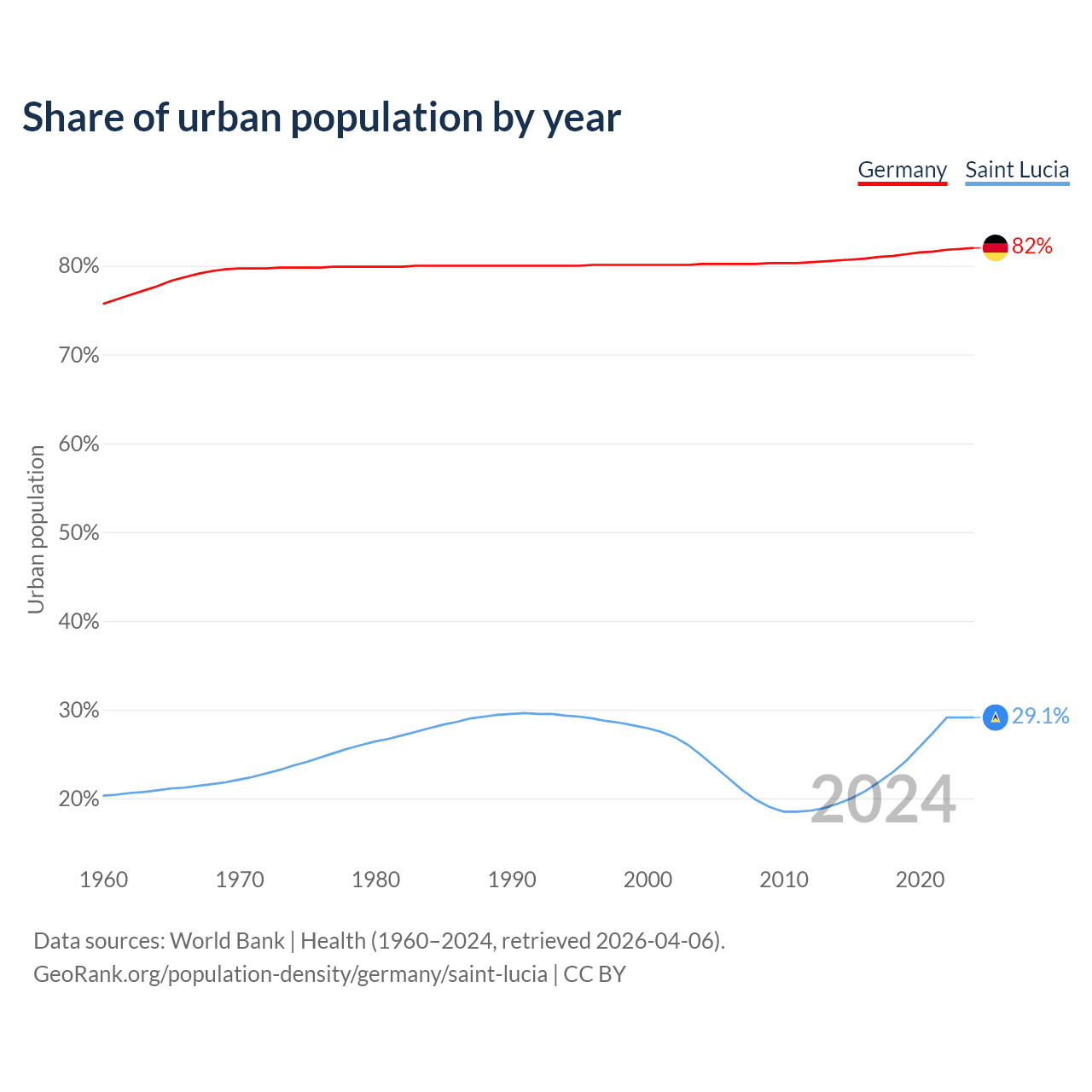 From 2004 to 2024, the share of urban population changed from 80.2% to 82% in Germany and from 24.8% to 29.1% in Saint Lucia.