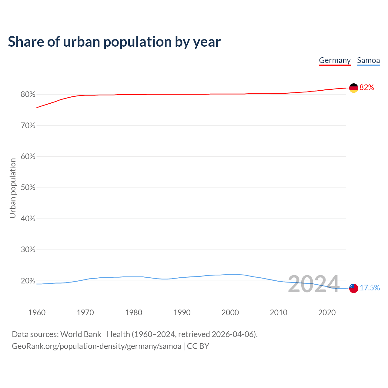 From 2004 to 2024, the share of urban population changed from 80.2% to 82% in Germany and from 21.5% to 17.5% in Samoa.