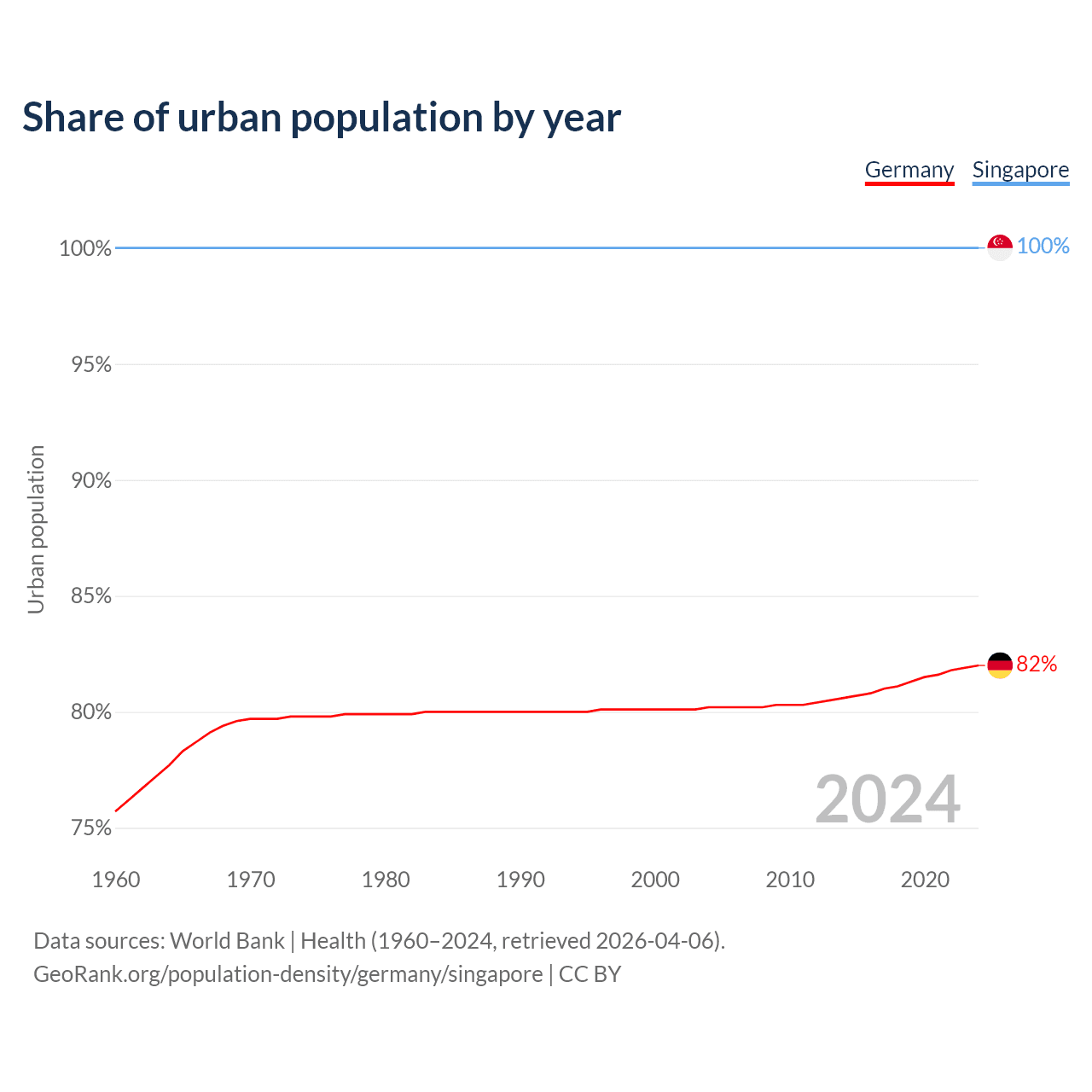 From 2004 to 2024, the share of urban population changed from 80.2% to 82% in Germany and from 100% to 100% in Singapore.