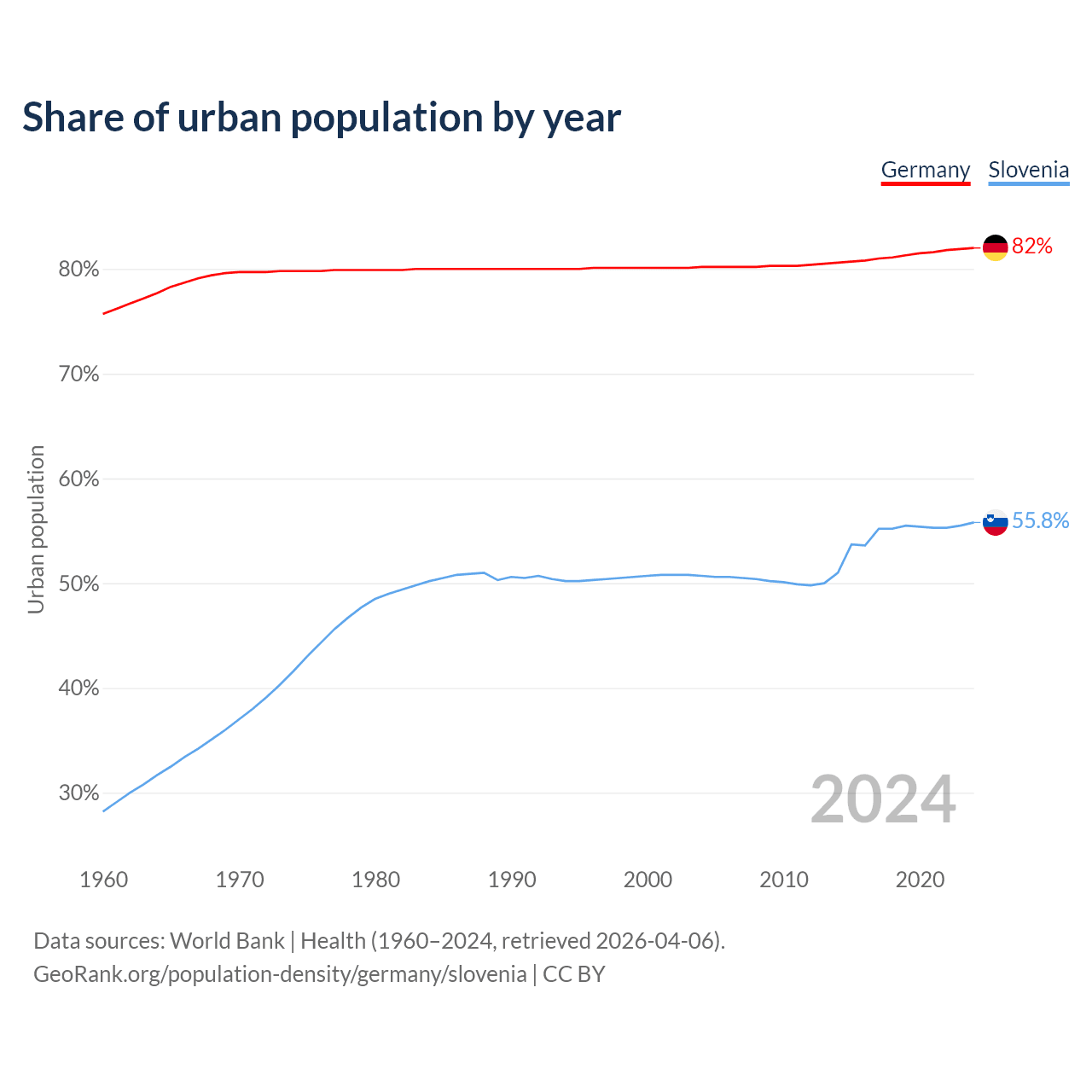 From 2004 to 2024, the share of urban population changed from 80.2% to 82% in Germany and from 50.7% to 55.8% in Slovenia.