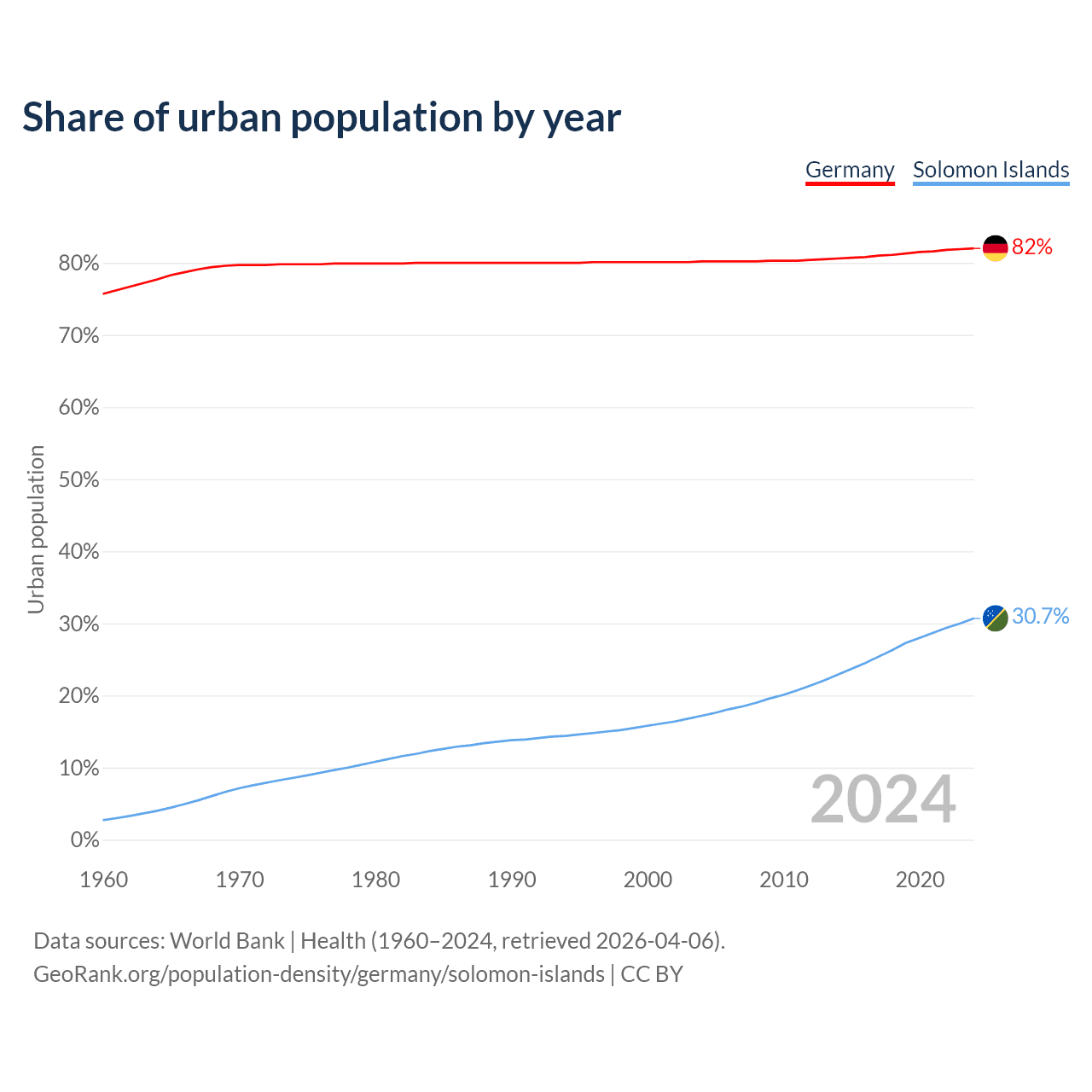 From 2004 to 2024, the share of urban population changed from 80.2% to 82% in Germany and from 17.2% to 30.7% in the Solomon Islands.