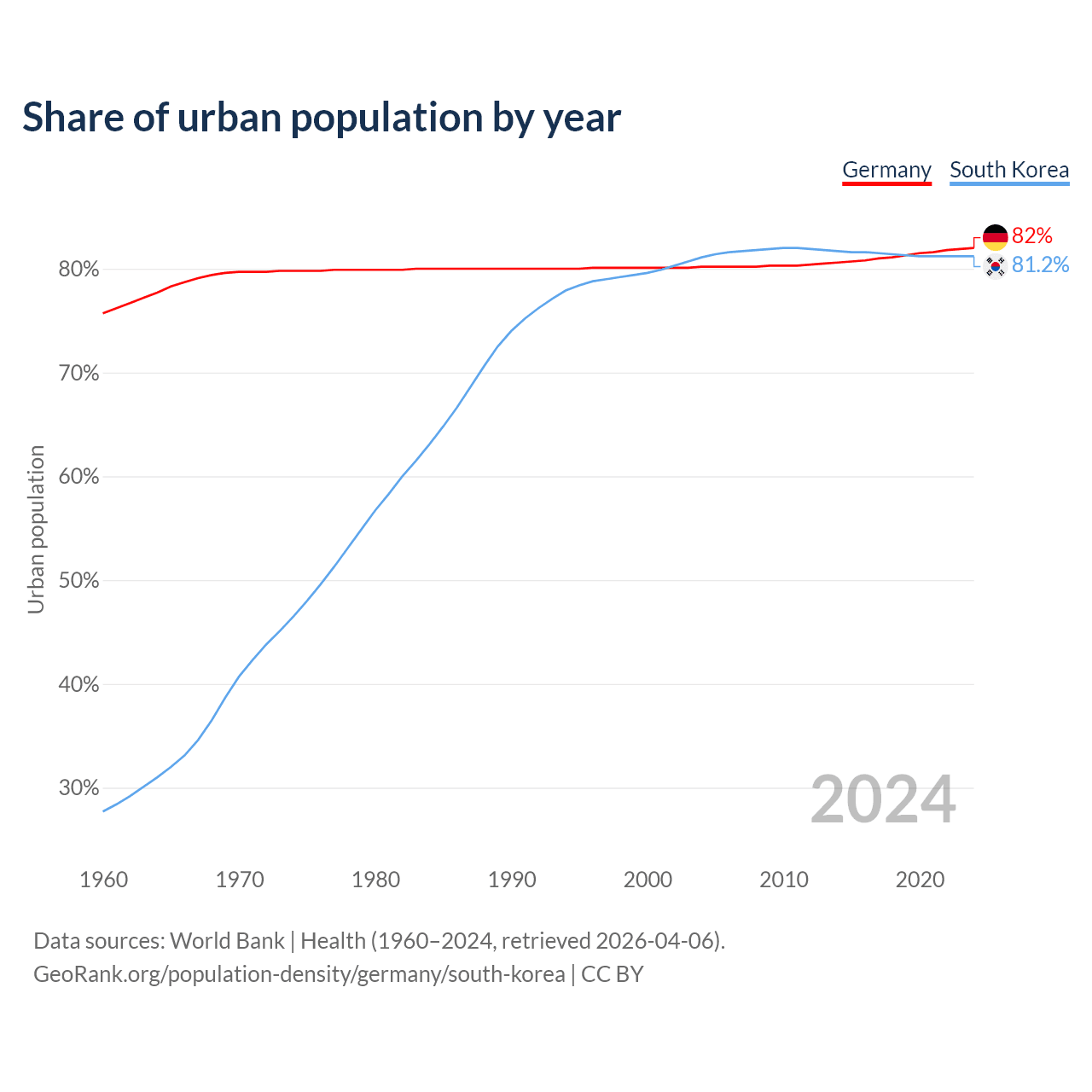 From 2004 to 2024, the share of urban population changed from 80.2% to 82% in Germany and from 81.1% to 81.2% in South Korea.