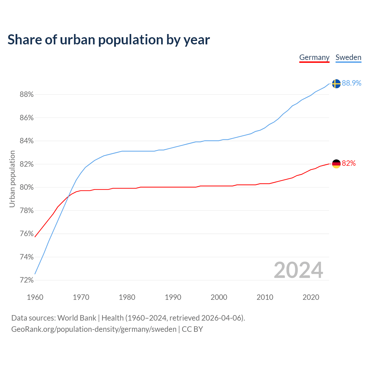From 2004 to 2024, the share of urban population changed from 80.2% to 82% in Germany and from 84.3% to 88.9% in Sweden.