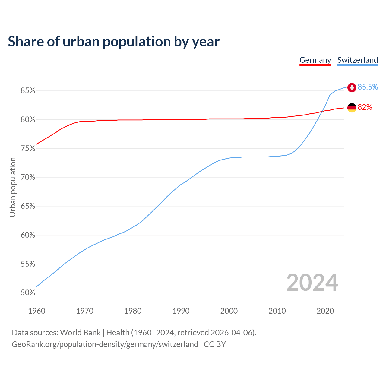 From 2004 to 2024, the share of urban population changed from 80.2% to 82% in Germany and from 73.5% to 85.5% in Switzerland.
