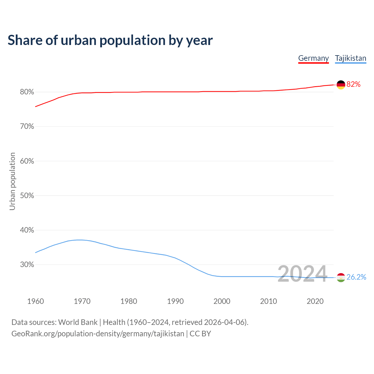 From 2004 to 2024, the share of urban population changed from 80.2% to 82% in Germany and from 26.5% to 26.2% in Tajikistan.