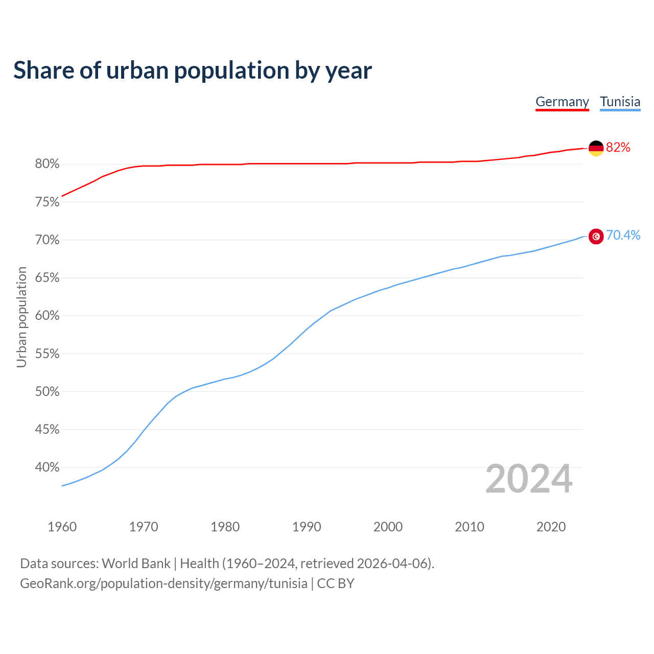 From 2004 to 2024, the share of urban population changed from 80.2% to 82% in Germany and from 64.9% to 70.4% in Tunisia.