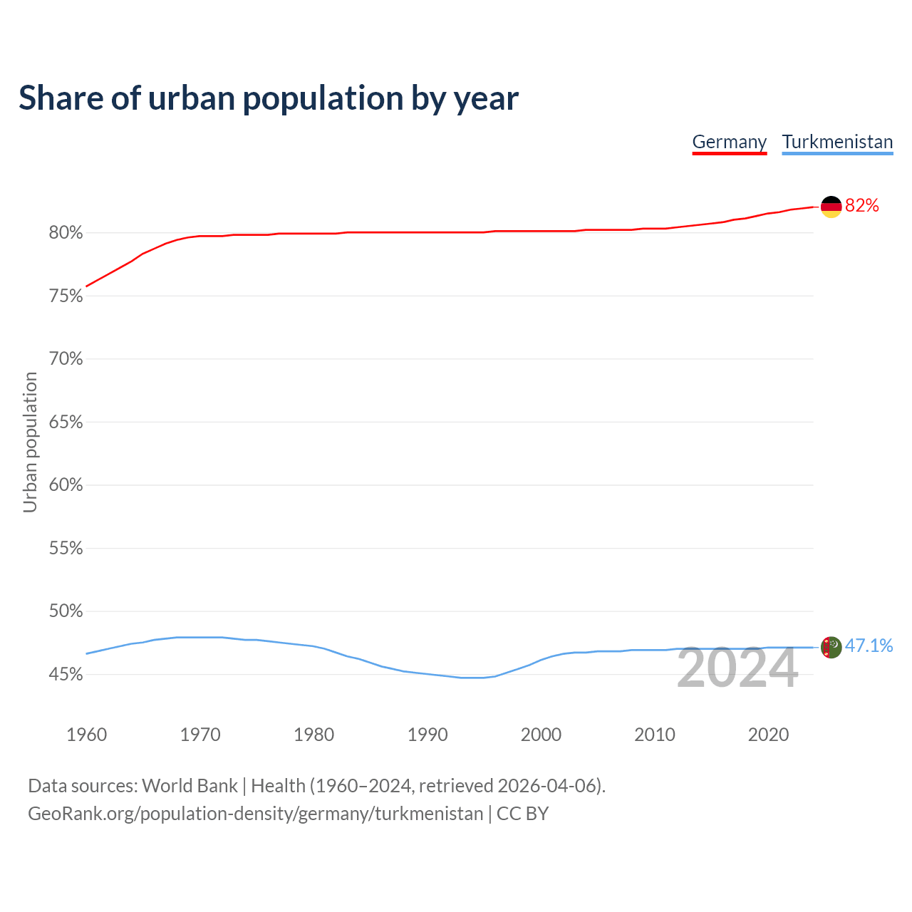 From 2004 to 2024, the share of urban population changed from 80.2% to 82% in Germany and from 46.7% to 47.1% in Turkmenistan.